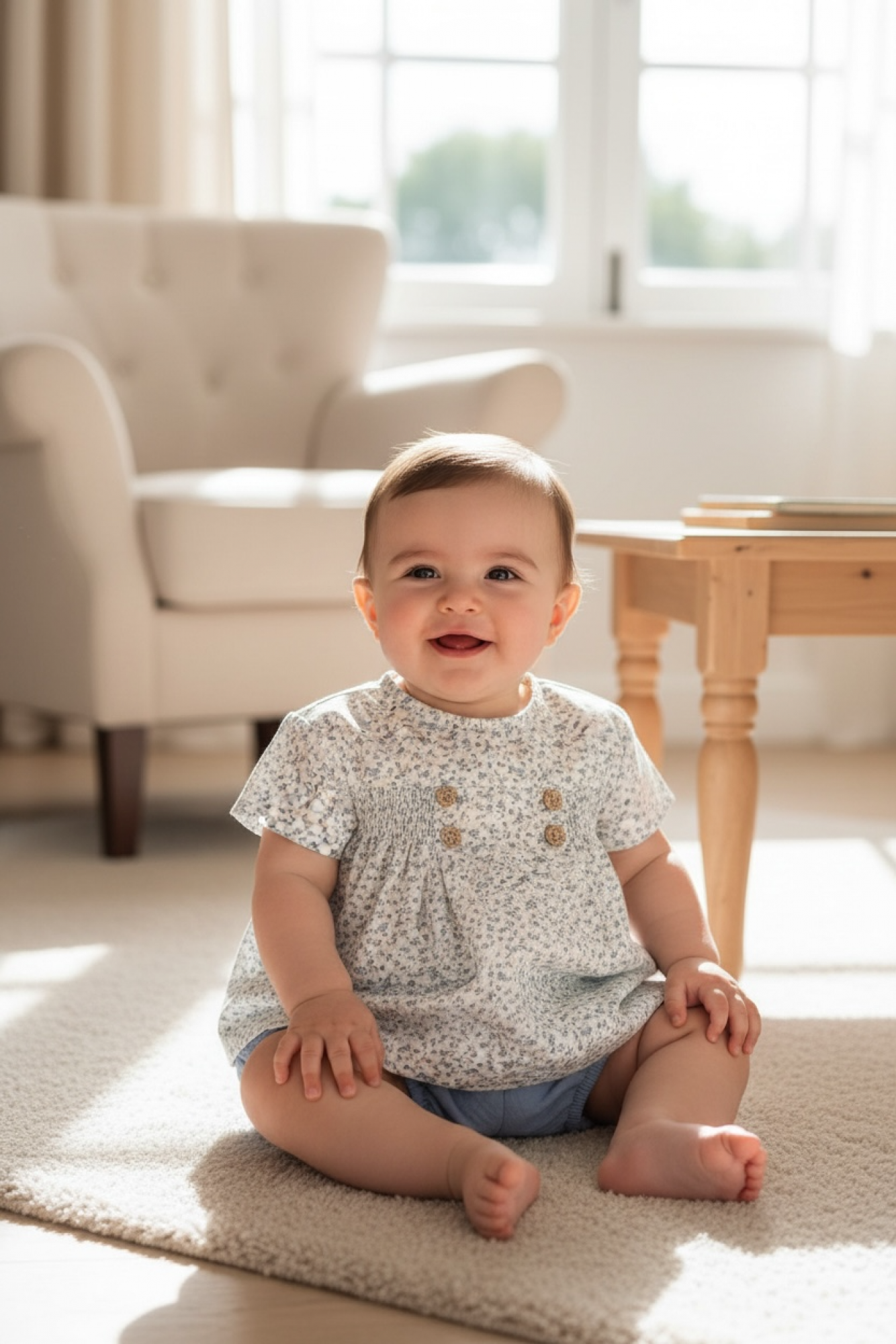 La blusita es de popelín liberty celeste con bombachito de muselina en Azul empolvado.