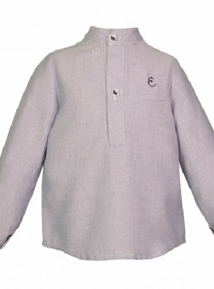 Original conjunto para niño compuesto por camisa de viella en tonos jeans y cuello Mao con botones de perrito a juego en el resto de la colección y pantalón corto de viella con lana en cuadro en tonos marino. Marrón y gris.