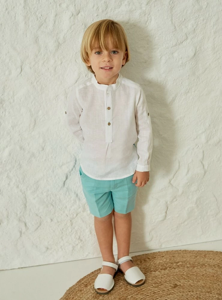 Confeccionado en en lino. Camisa blanca con botón hasta la cintura y cuello mao. Pantalón cortito en verde turquesa.