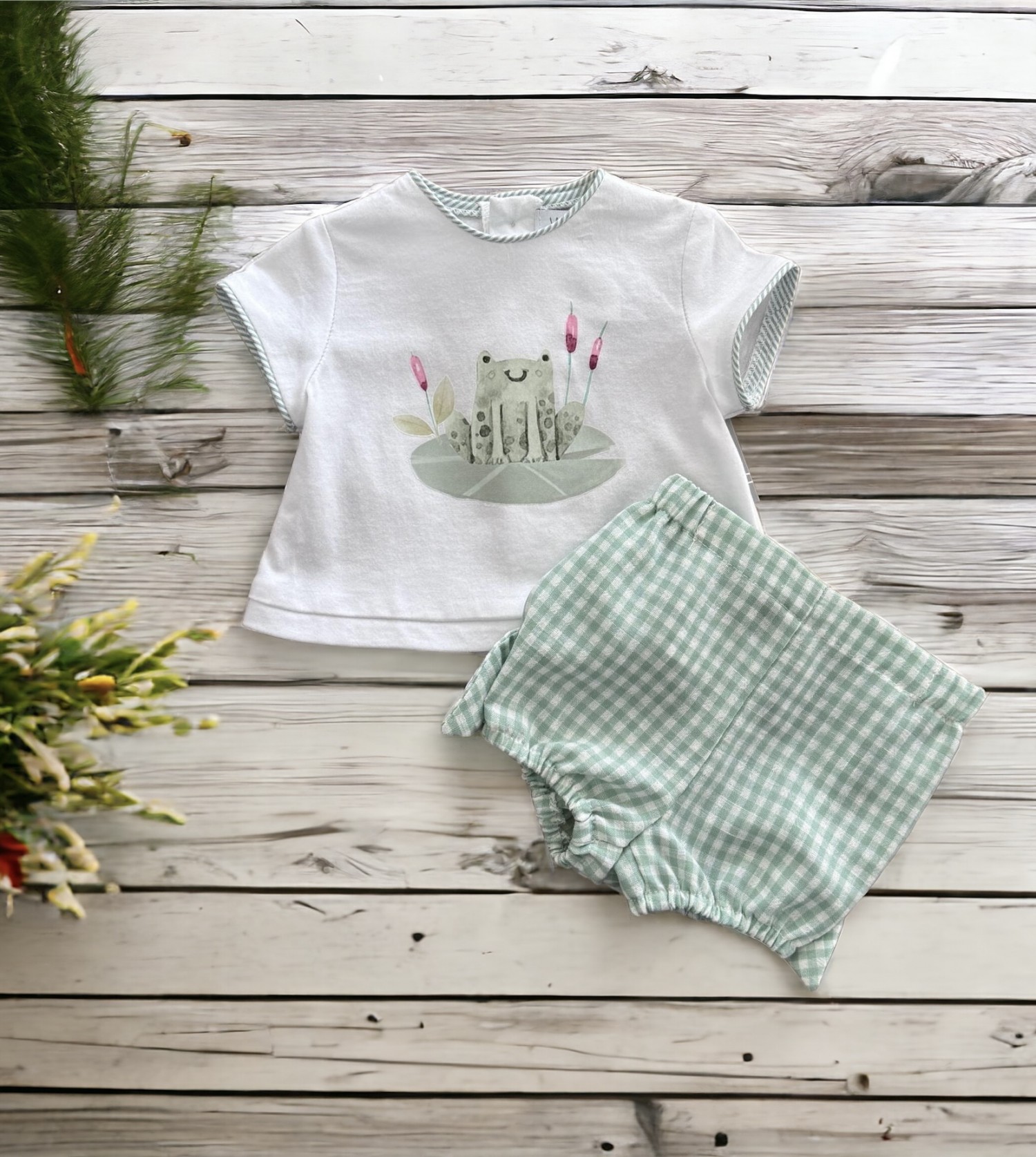 Camiseta blanca con una bonita ranita lleva remate en cuello y manga de rayas en verde agua, bombacho vichy en los mismos tonos.