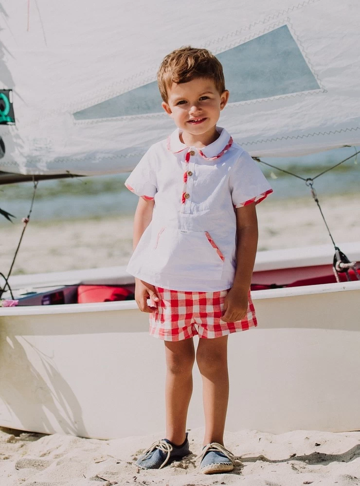 Blusita de batista blanco con cuello bebé y bolsillo canguro rematado en cuadro vichy a juego con el pantalon.