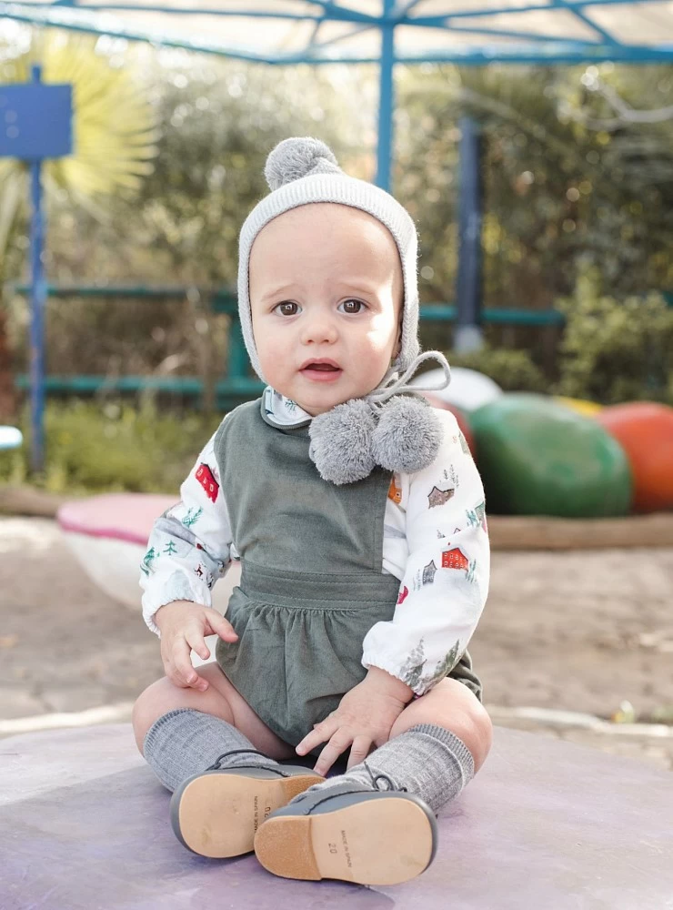 Peto en verde musgo de panita fina y blusa fondo crudo y estampado casitas con cuello bebé.
