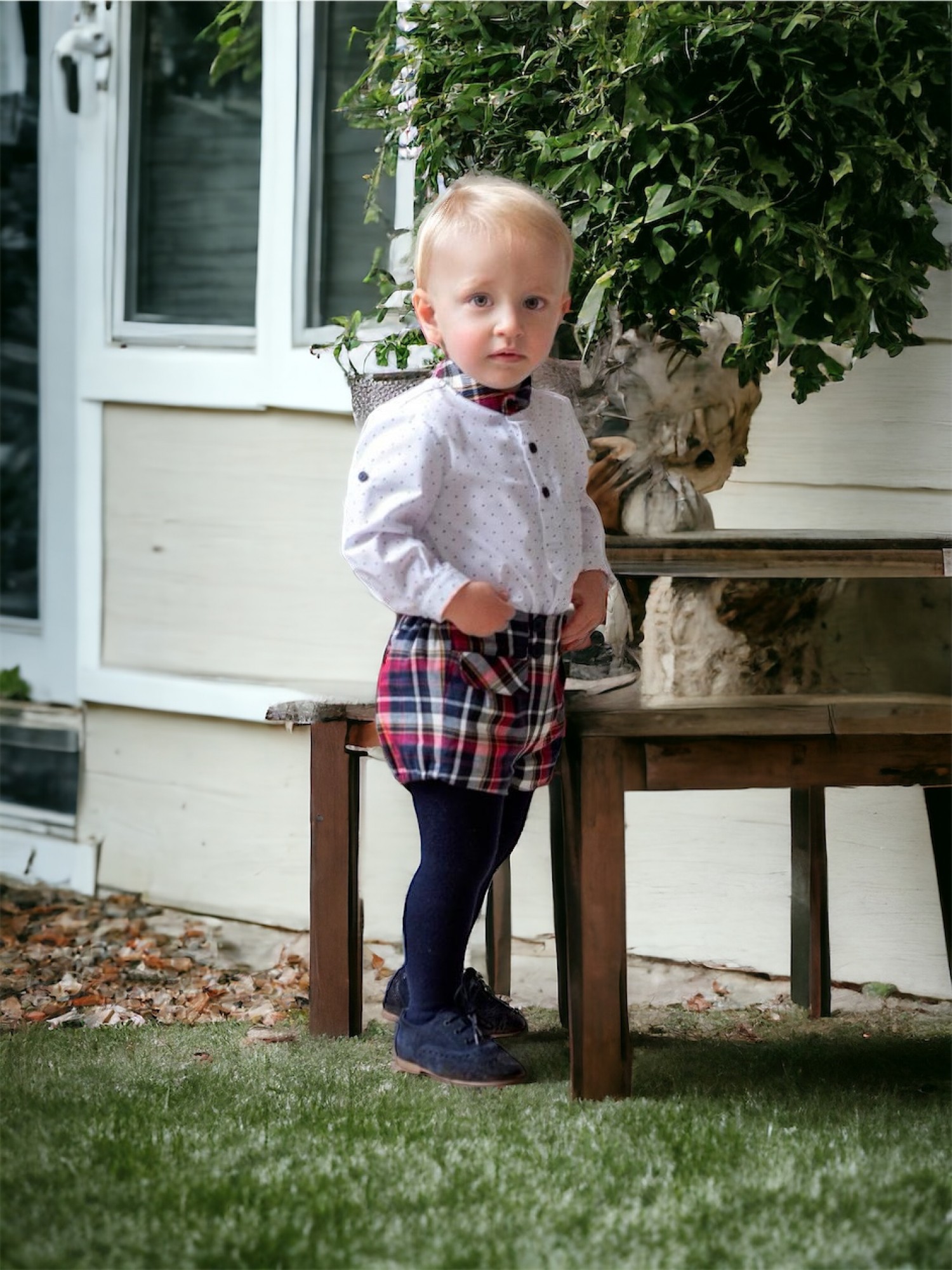 Blusa de viella blanca con topos marino, lleva cuello mao de franela fina a juego con el pantalón de cuadro Escocés