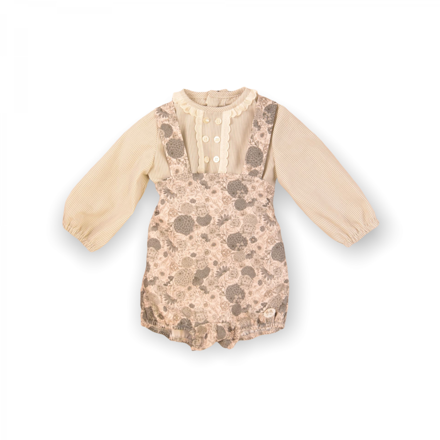 Compuesto ranita estampado flores color porcelana y blusa de rayas.
