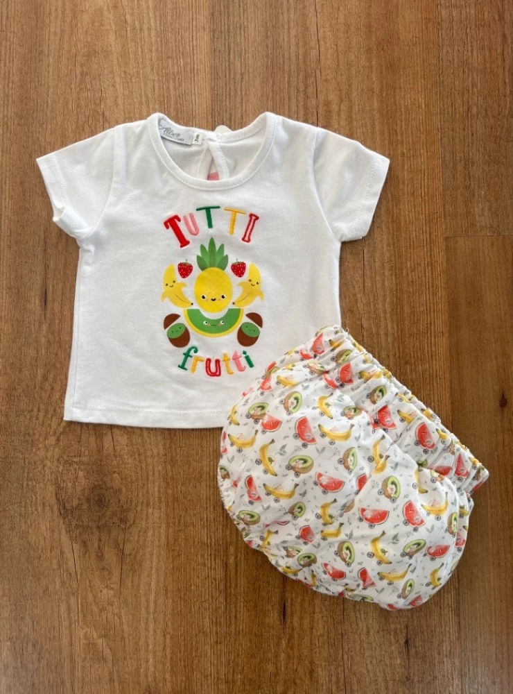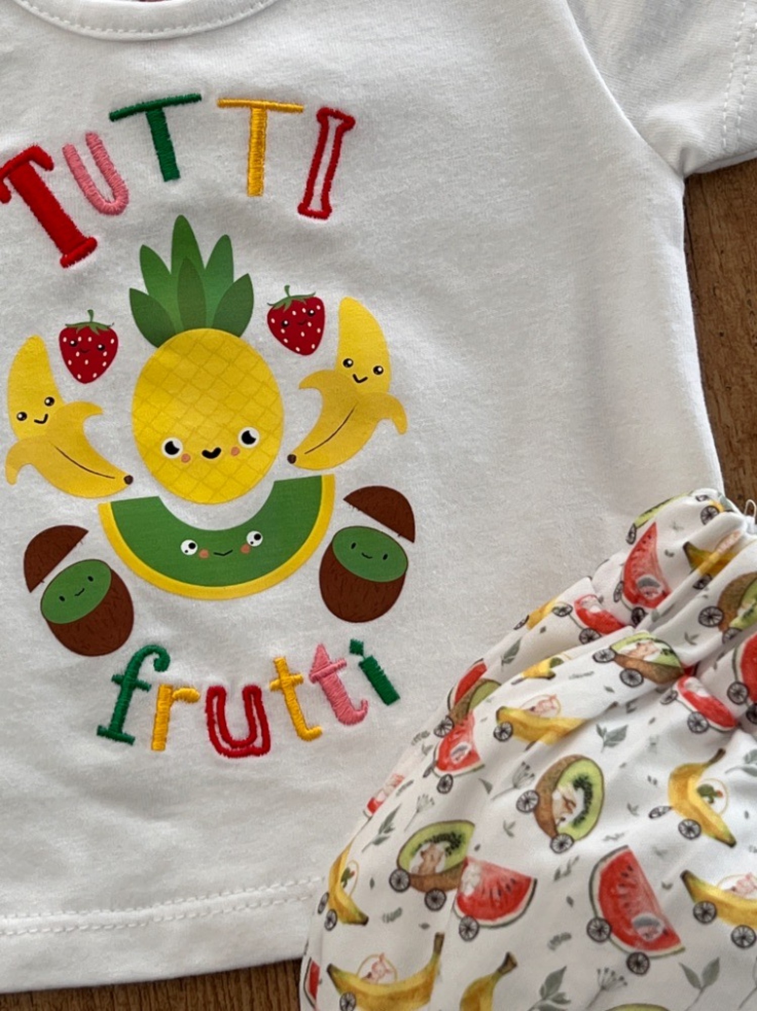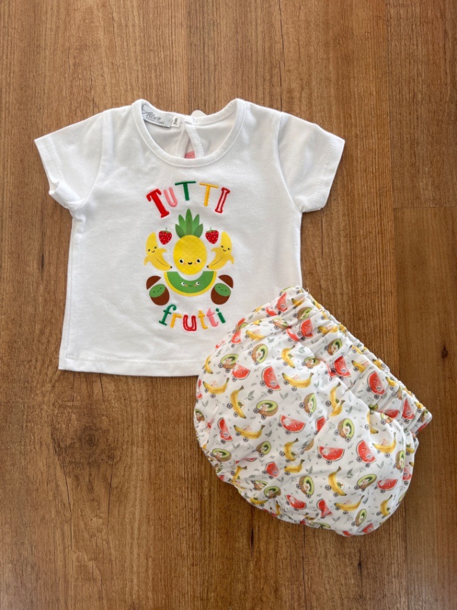 Confeccionado en algodón 100 x 100. Camiseta blanca con estampado bordado y bombacho a juego.