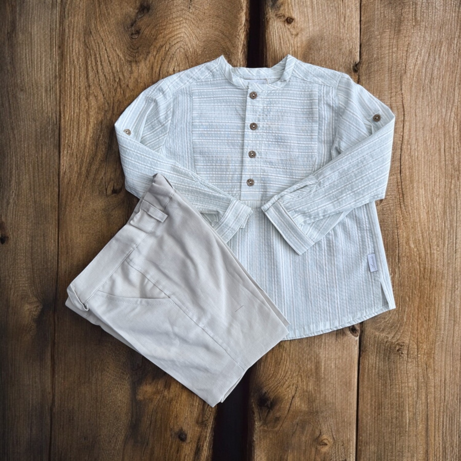 Camisa en bambula de rayas en tonos verde salvia y crudo, con pantalón por la rodilla de lino color arena