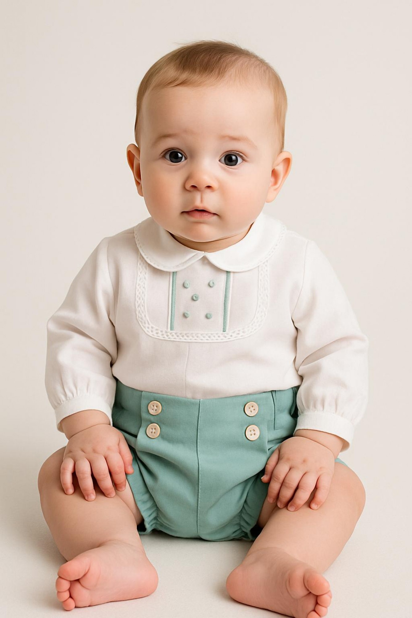 Blusa de viella blanca con cuellos bebé. lleva bodoques bordados en color verde del mismo tono al pantalón bombachito.