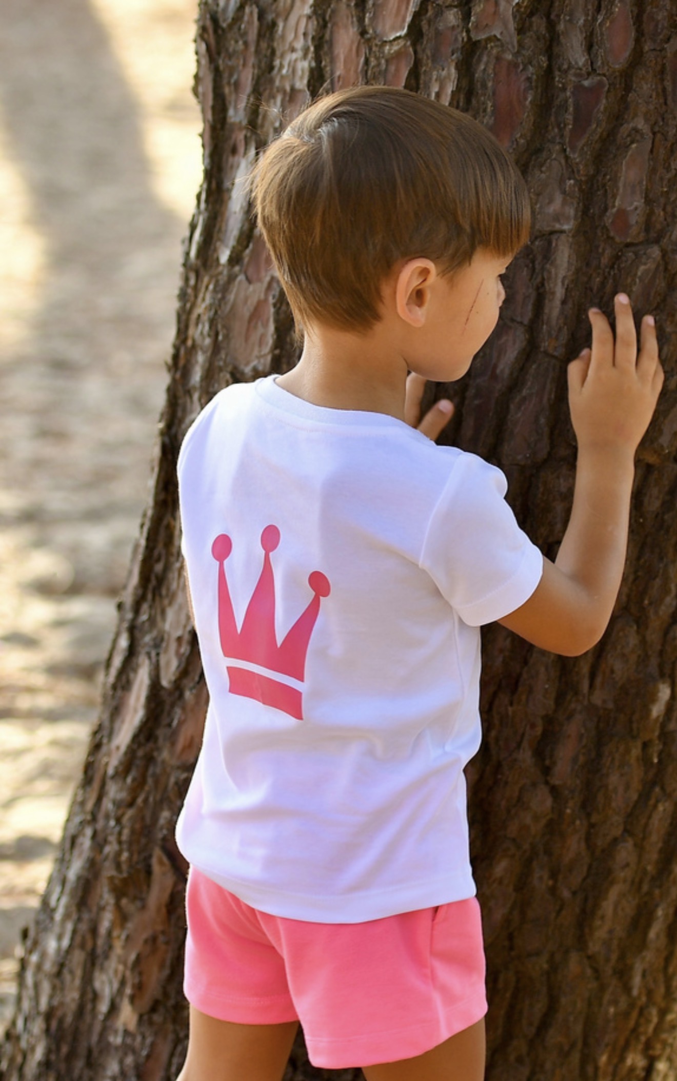 En la parte trasera destaca una gran corona estampada en color rosa intenso/fucsia, convirtiéndose en el protagonista del conjunto y aportando un aire moderno y desenfadado.