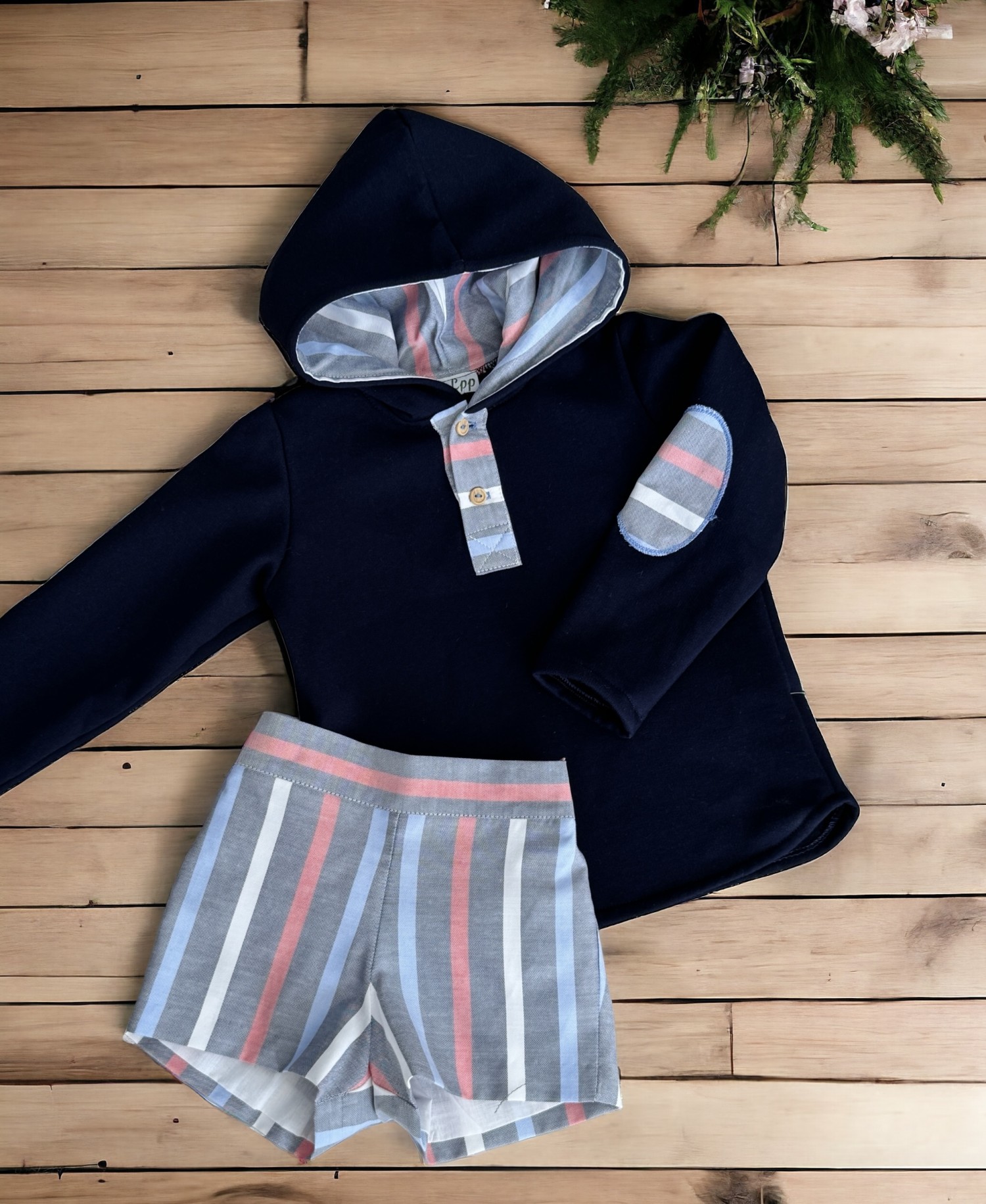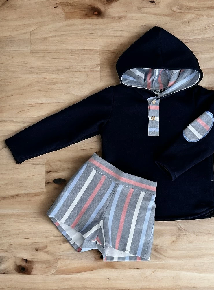 Sudadera de algodón gordito azul marino con capucha, rematada en tejido sarga de rayas a juego con el pantalón corto. ideal para vestir o sport. Una linea bonita y perfecta para cualquier ocasión
