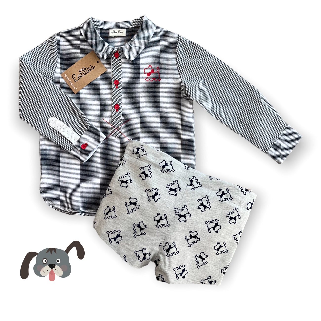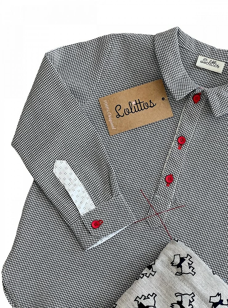 Camisa en vichy negro con cuello picos y detalles en rojo y pantalón en viella color gris con perritos en silueta de terciopelo negro.