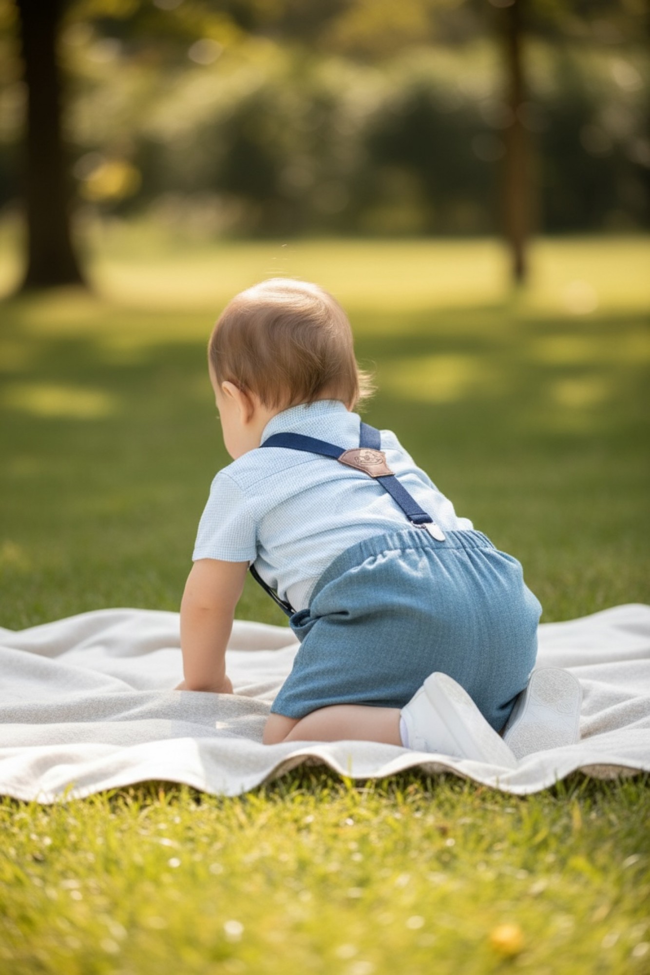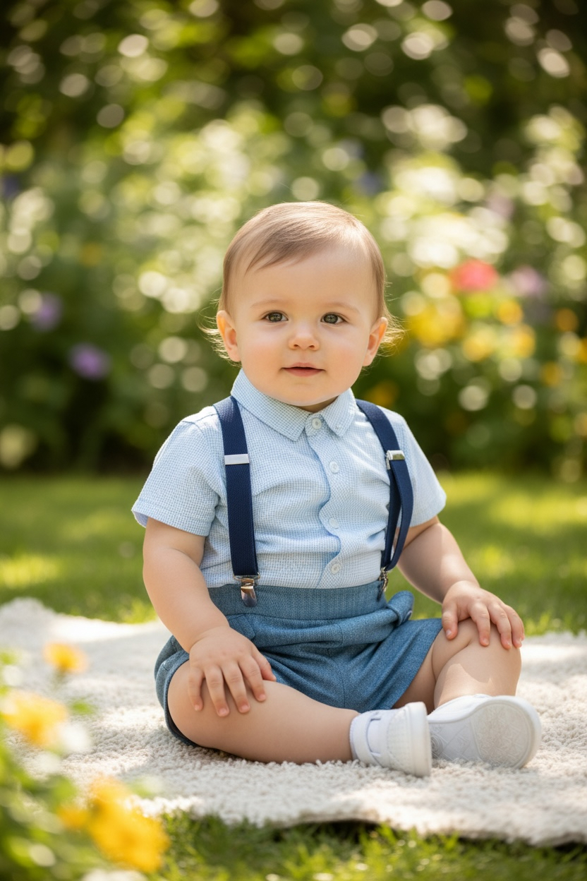 Conjunto de niño compuesto por camisa de manga corta y pantalón, acompañado de tirantes desmontables. Un diseño cuidado y elegante, ideal para ocasiones especiales y eventos de verano.