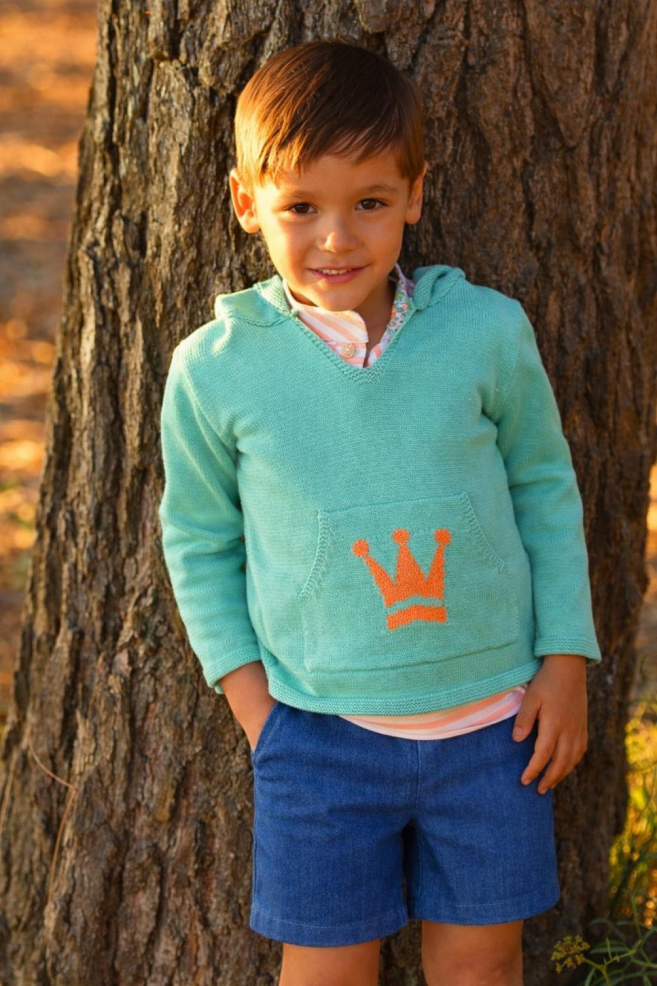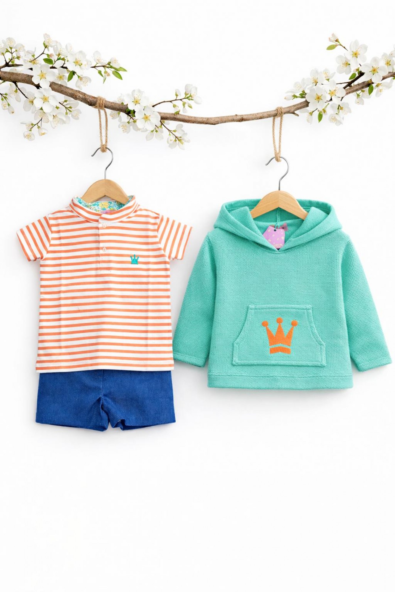 Se acompaña de sudadera con capucha en tono verde agua, con bolsillo delantero y bordado de corona en color coral que aporta un toque original y muy veraniego.
