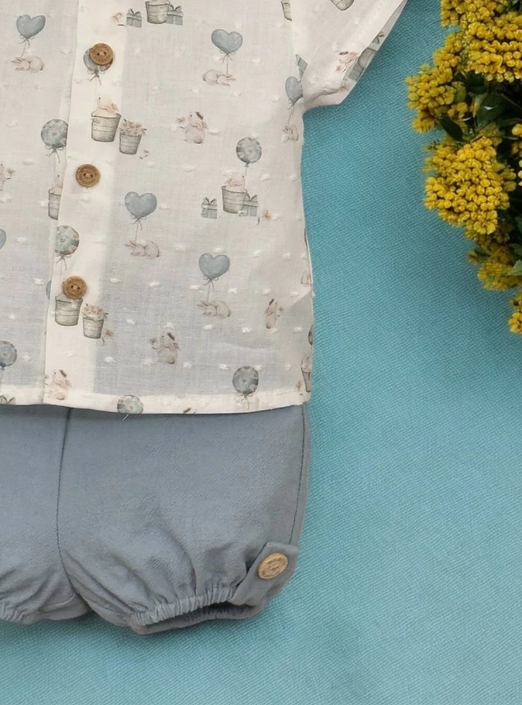 Dos piezas: Blusita de plumeti blanco con cuellos bebé, tiene un bonito estampado globos en tonos azul empolvado a juego con el bombachito.
