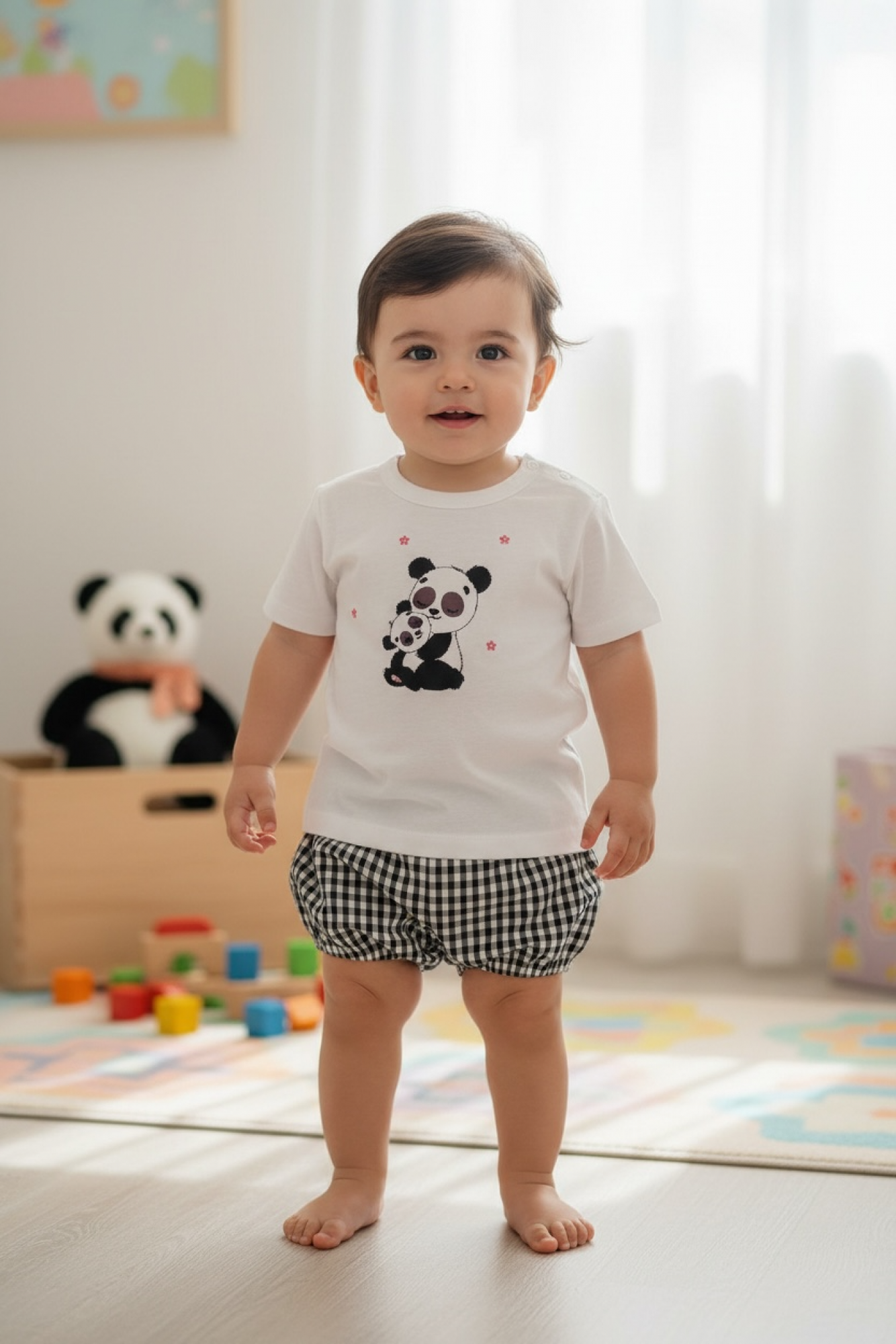Camiseta de algodón blanco con dibujo de ositos panda y bombachito vichy negro
