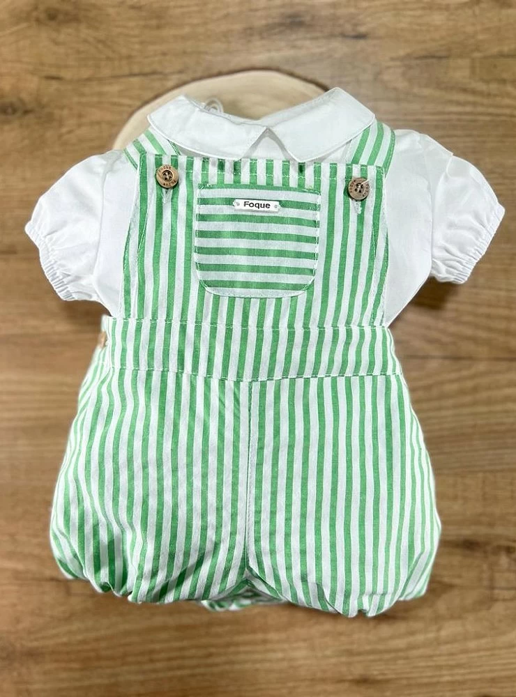 Blusita con cuello bebé y manguita farol confeccionada en batista blanco con peto voile color verde musgo y blanco de rayas.