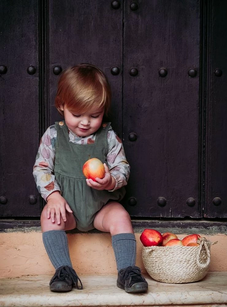 Peto tipo ranita en pana fina color verde con blusa de viella con estampado manzanas.