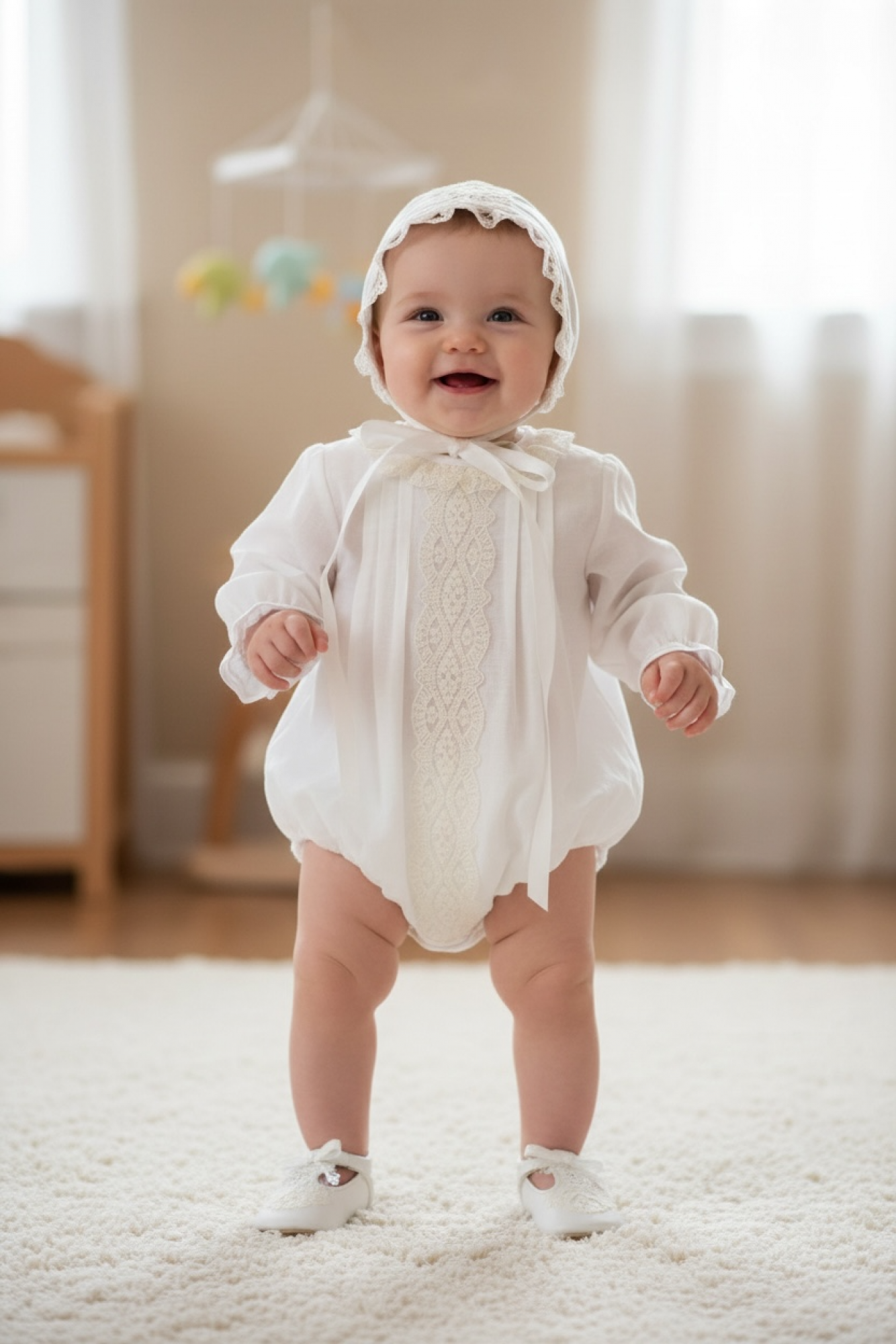 Pelele con detalles de puntilla bordada y acabados finos, pensado para que el bebé vaya arregladito sin perder comodidad.