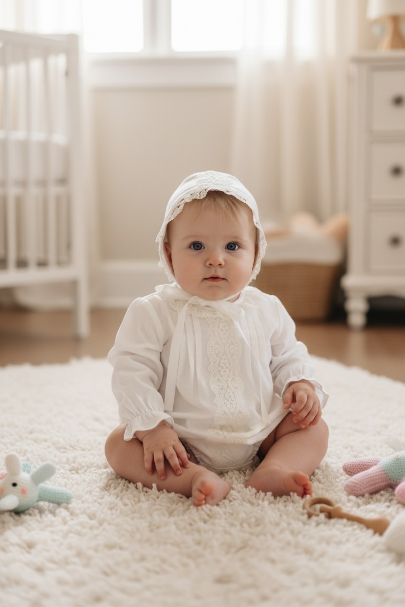 Capota a conjunto, rematada con encaje y lazadas suaves, para completar el look con un toque dulce.