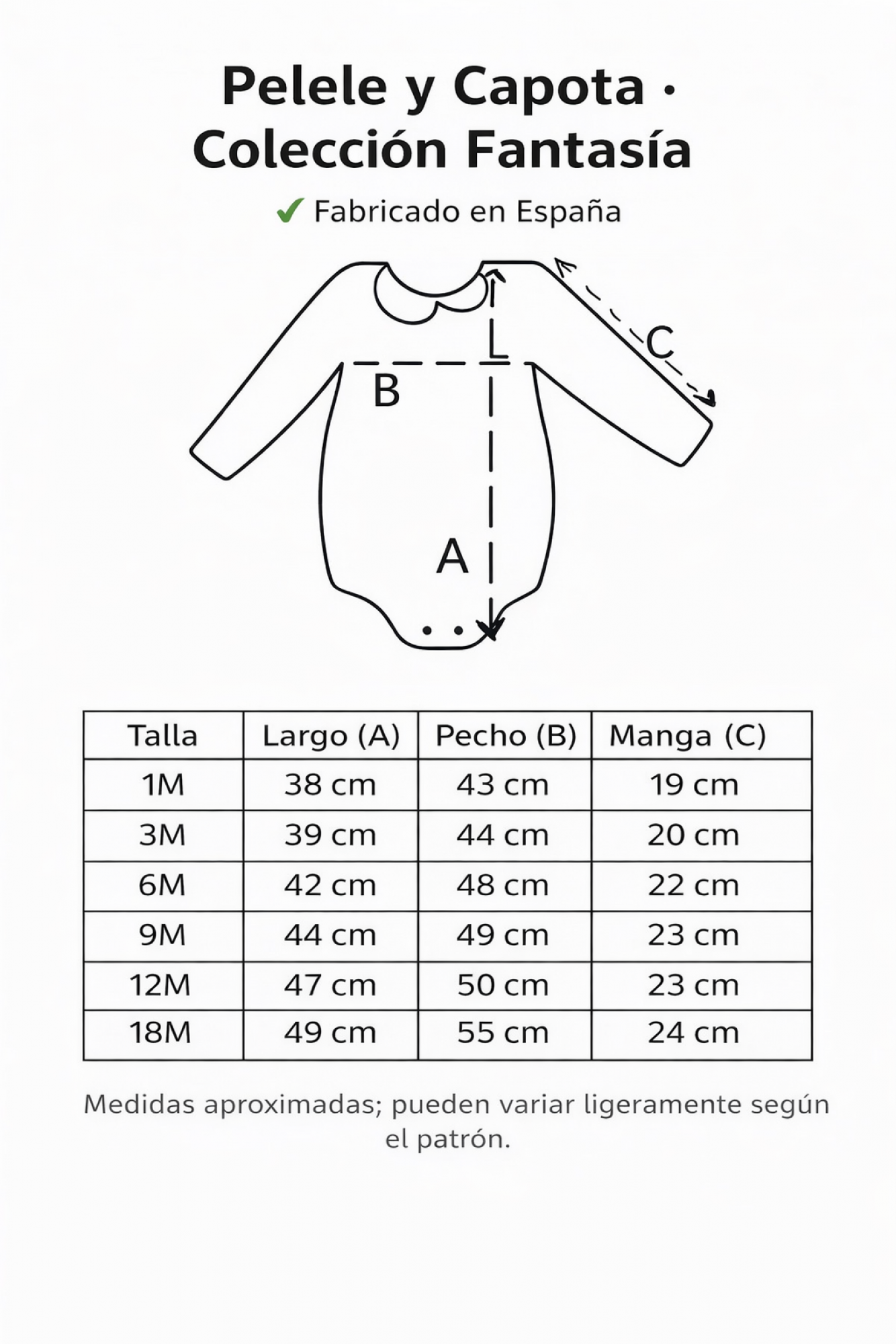 El pelele cuenta con manga larga hasta la muñeca, cuerpo trabajado y volumen suave en la parte inferior, cuidando tanto la estética como la comodidad del bebé. Va totalmente forrado al tono menos las mangas.