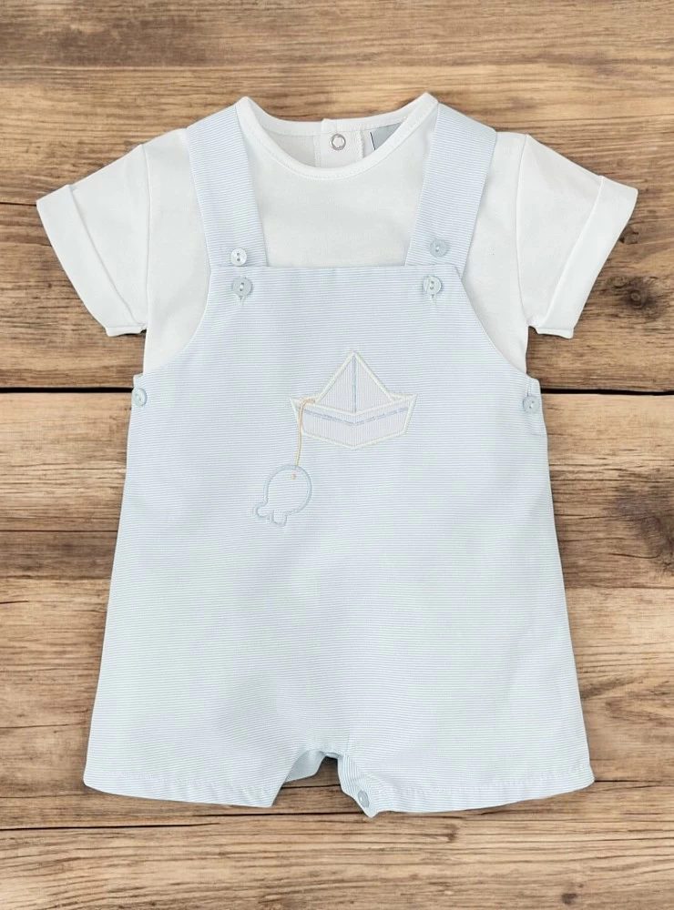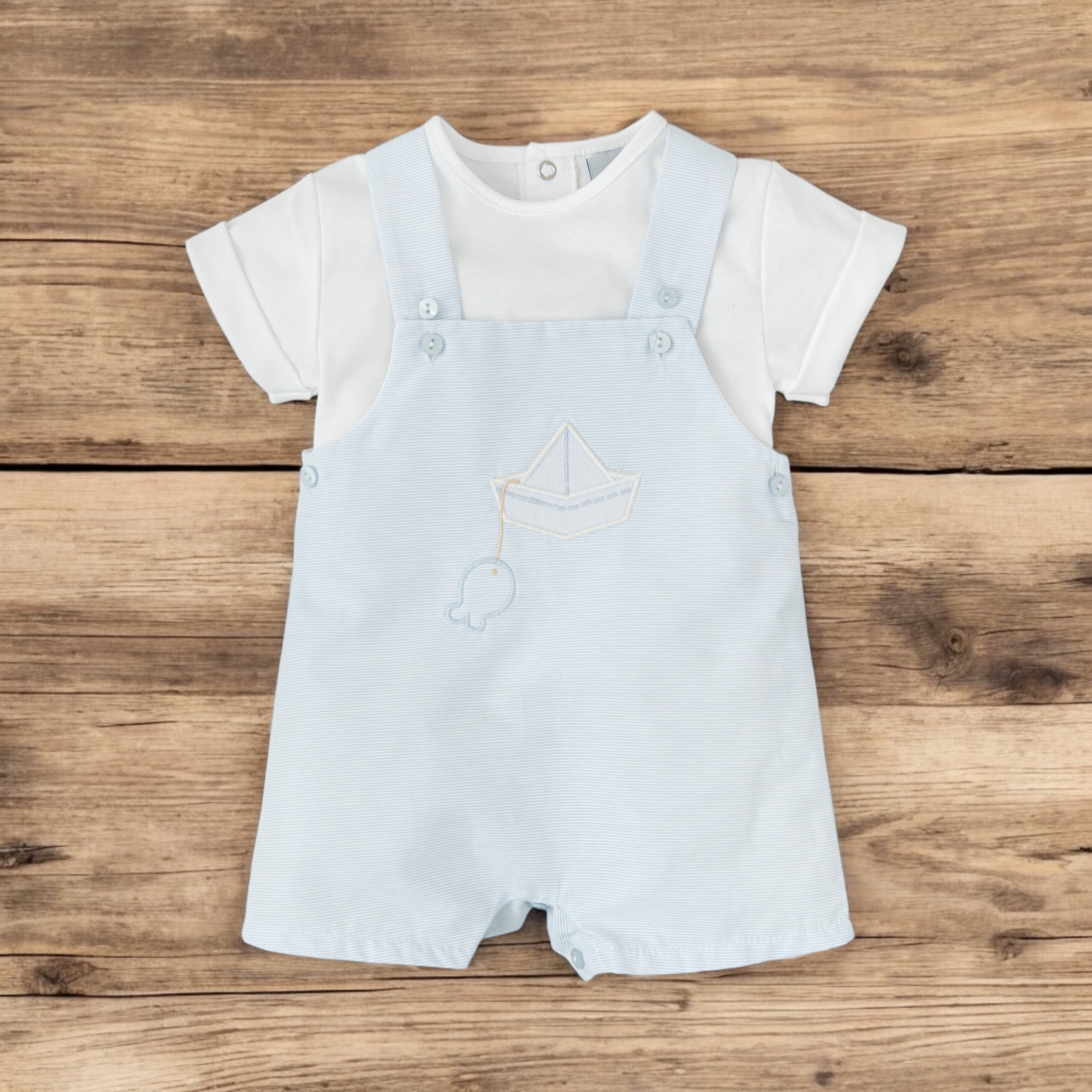 Peto de rayas azul y blanco con un gracioso barquito en el centro. y camiseta blanca básica en manga corta y sin cuello