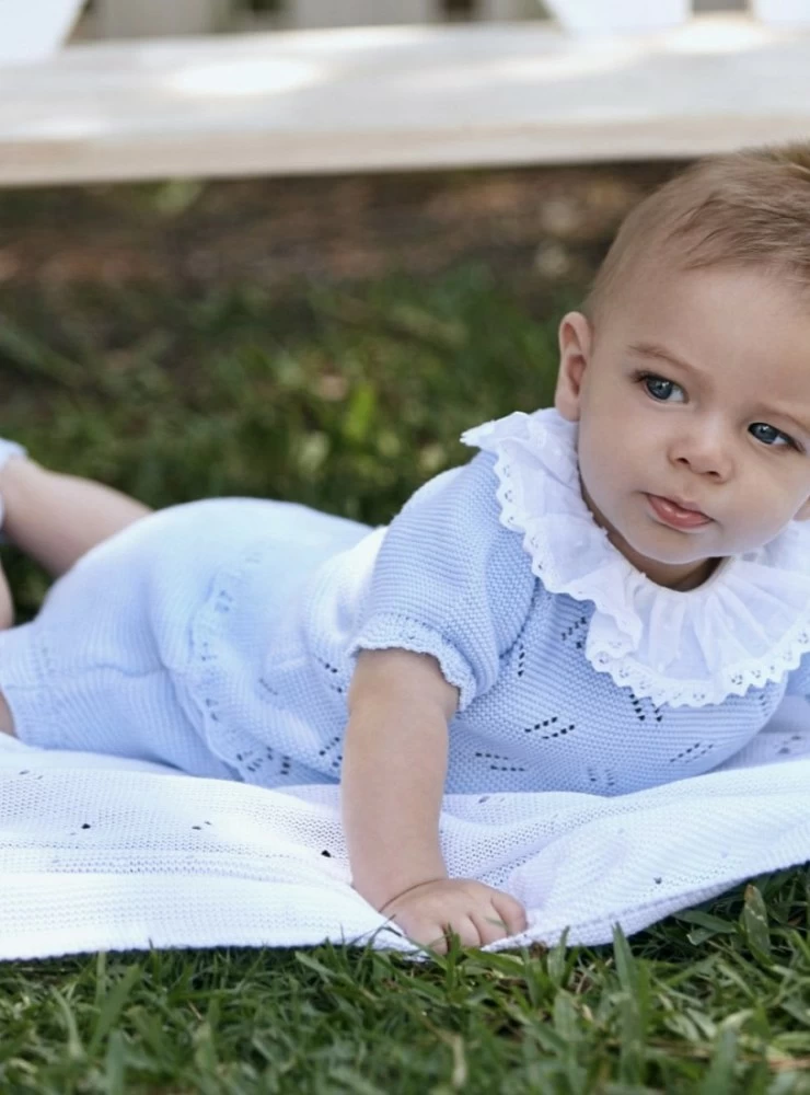 Compuesto por suéter en manga corta azul celeste en punto calado con cuello de plumeti blanco. Braga al tono en punto fino