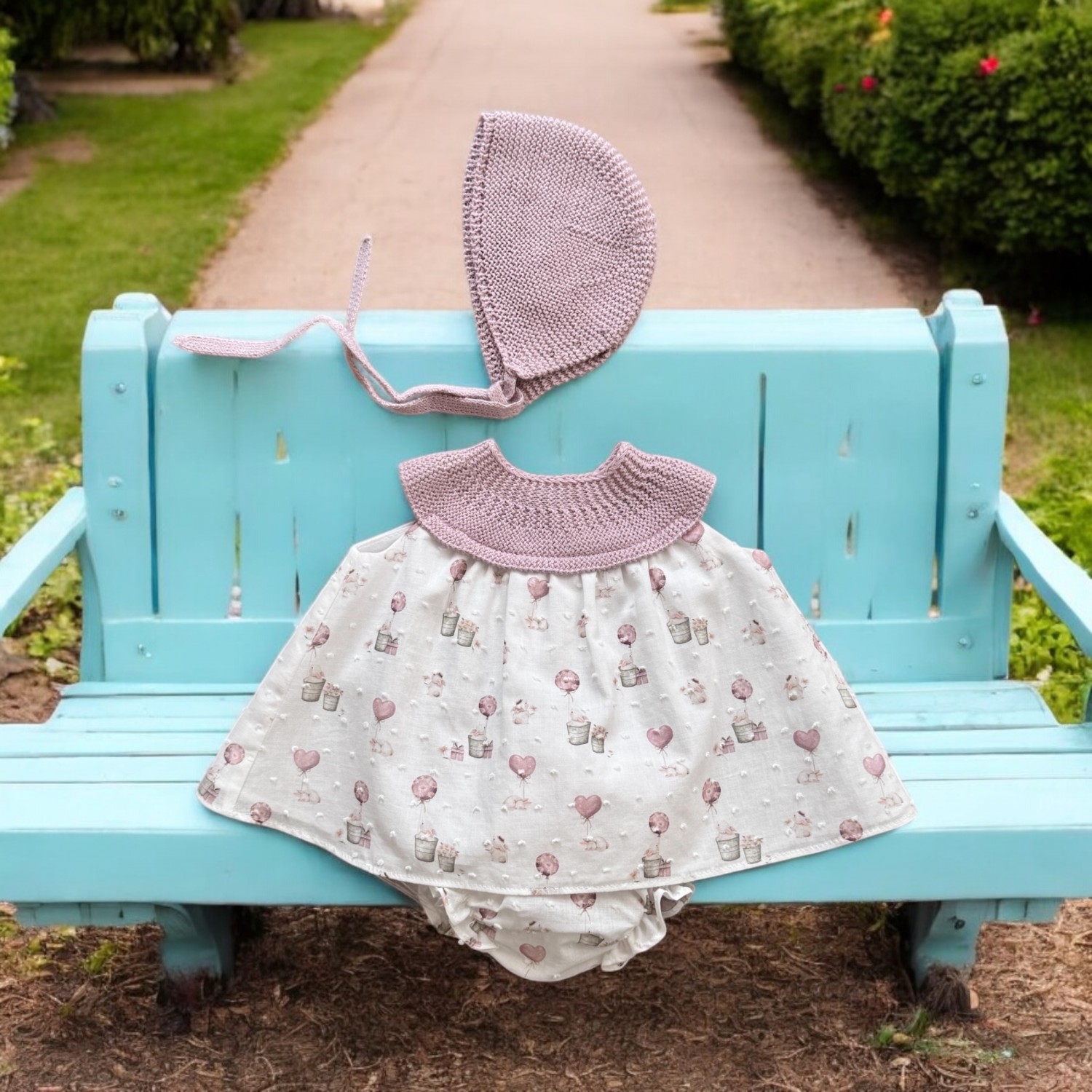 Jesusito con capota y braga. Combina plumeti con un finísimo estampado rosa empolvado con punto de verano