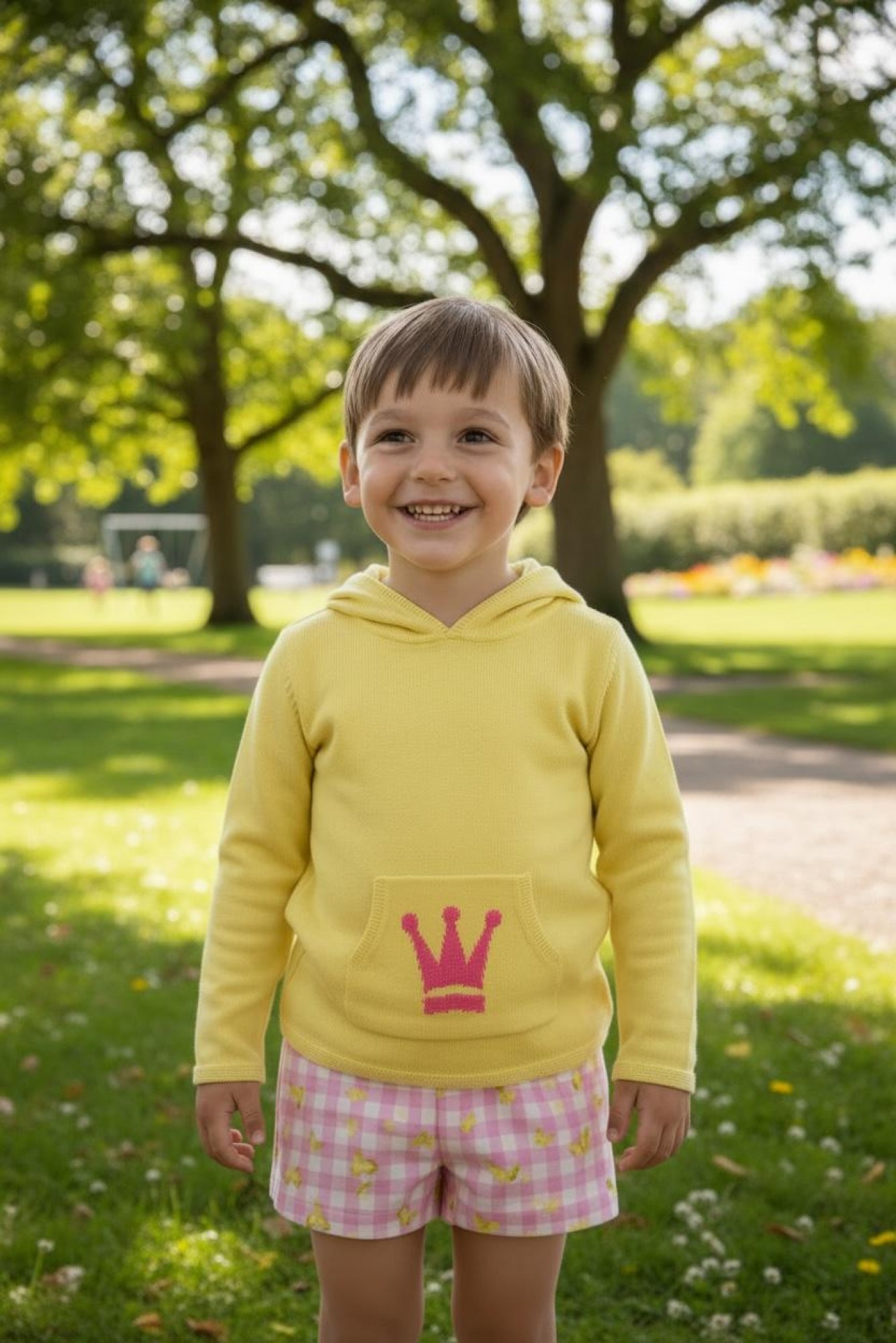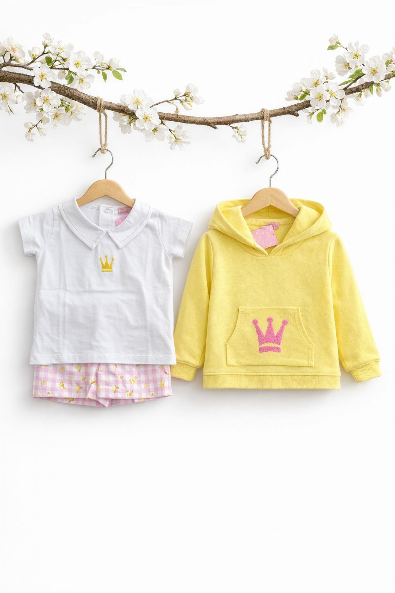 Se completa con sudadera de punto en tono amarillo con capucha, bolsillo delantero y bordado de corona en color rosa, aportando un toque divertido y muy dulce.