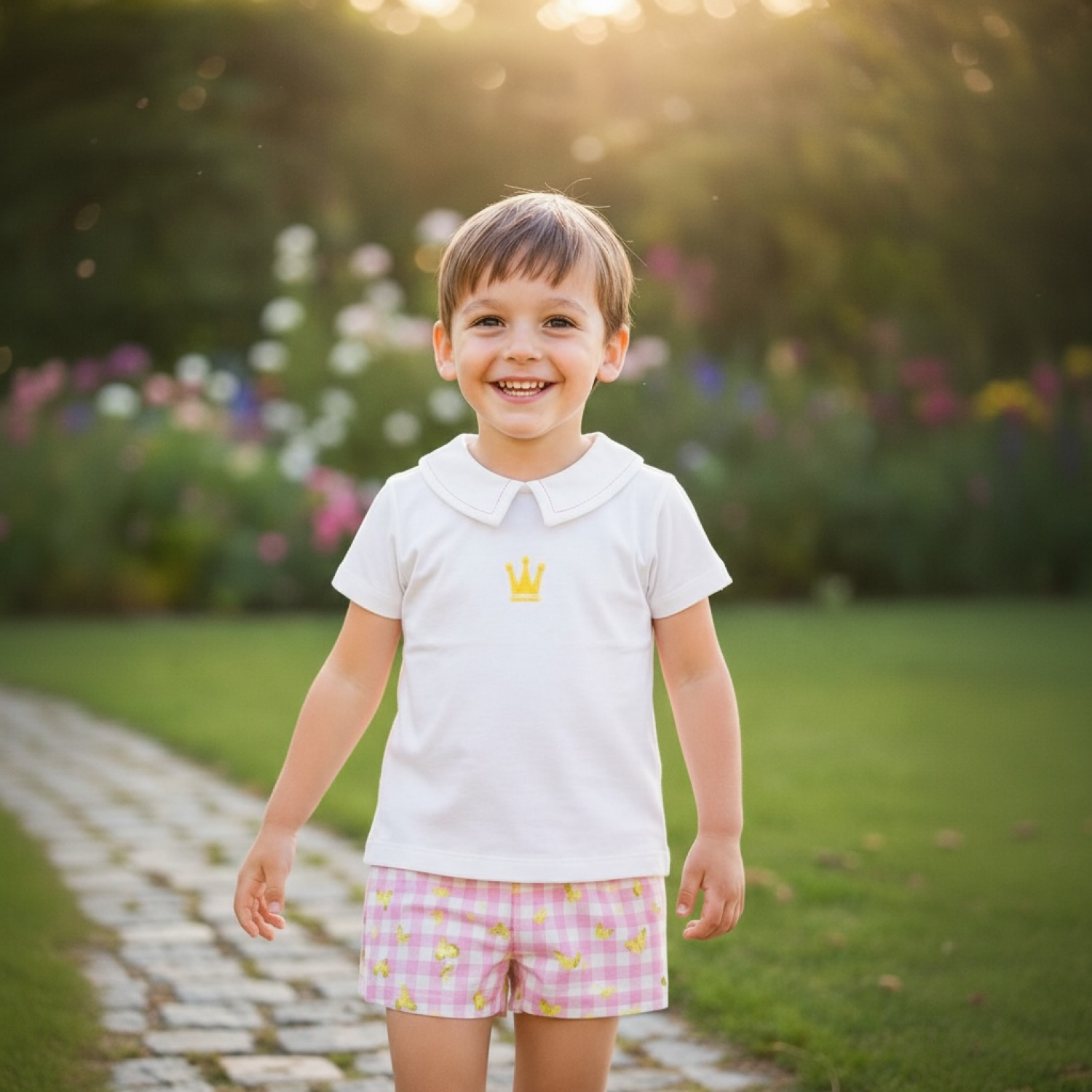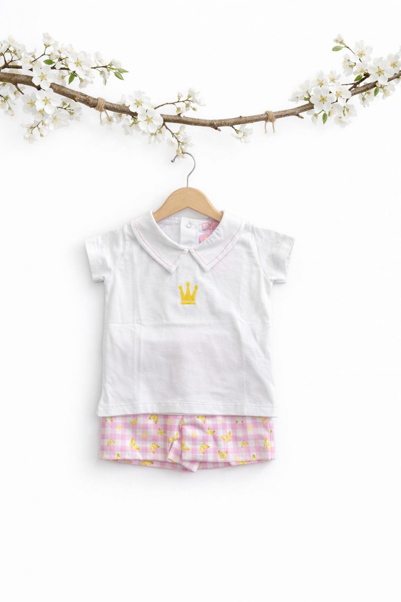 El bombacho está realizado en tejido de algodón con estampado de cuadros vichy rosa decorado con pequeñas mariposas en color amarillo, combinando perfectamente con el resto del conjunto.