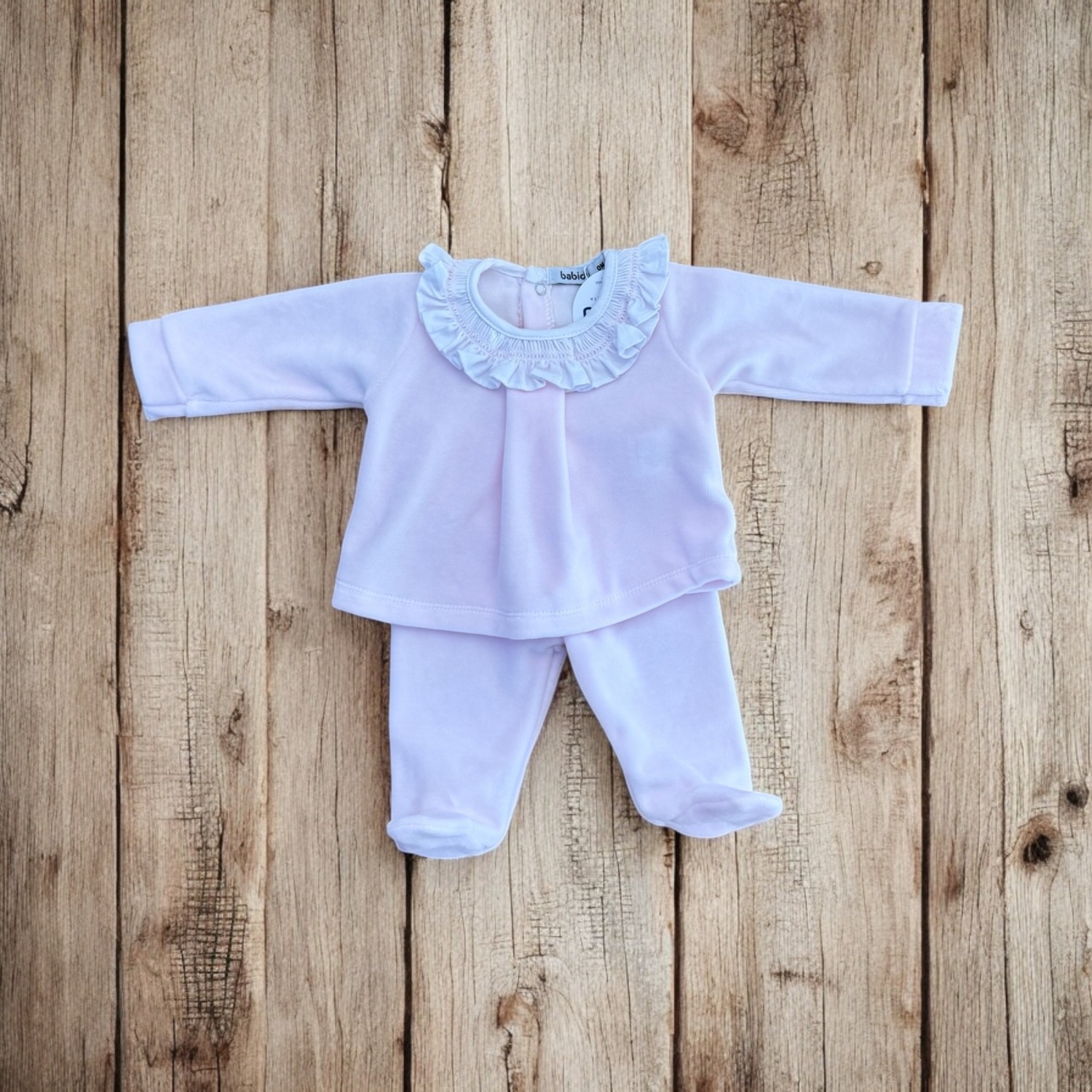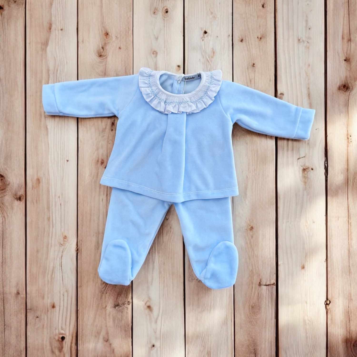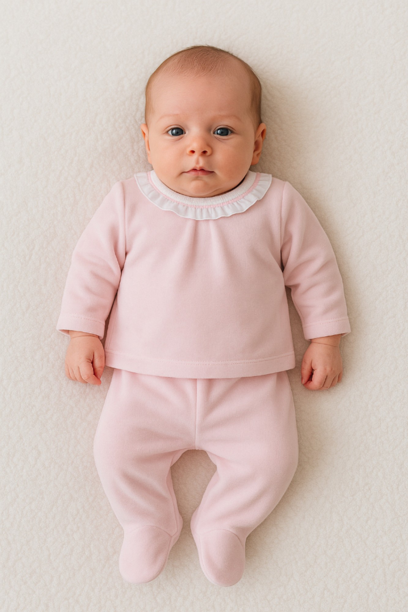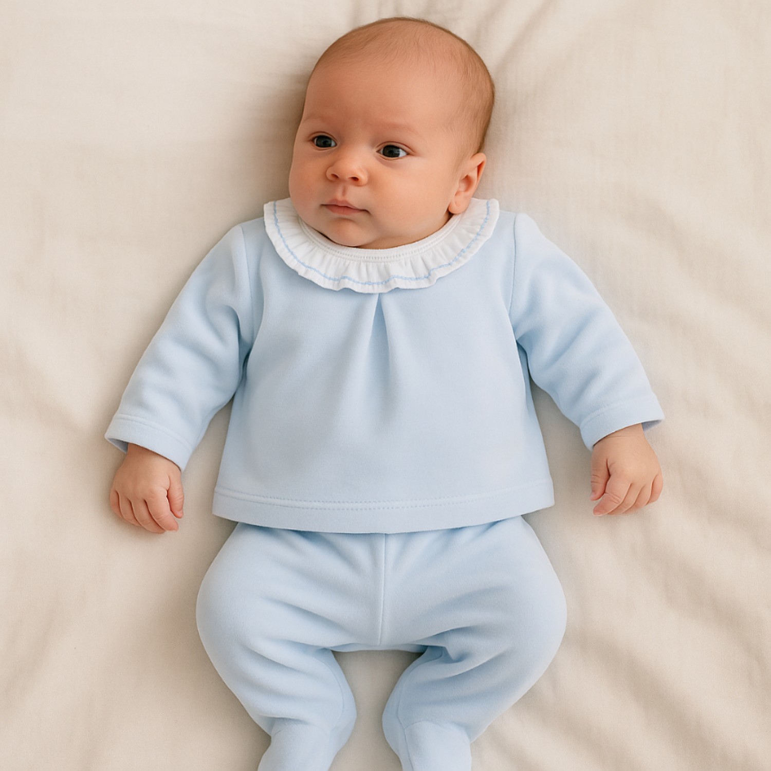 Conjunto de dos piezas tundosado, con acabado tipo terciopelo muy suave y cálido, disponible en azul bebé y rosa bebé. La parte superior luce un delicado cuello de batista con volante, rematado con un bordado en hilo al tono del conjunto, que aporta elegancia y dulzura.