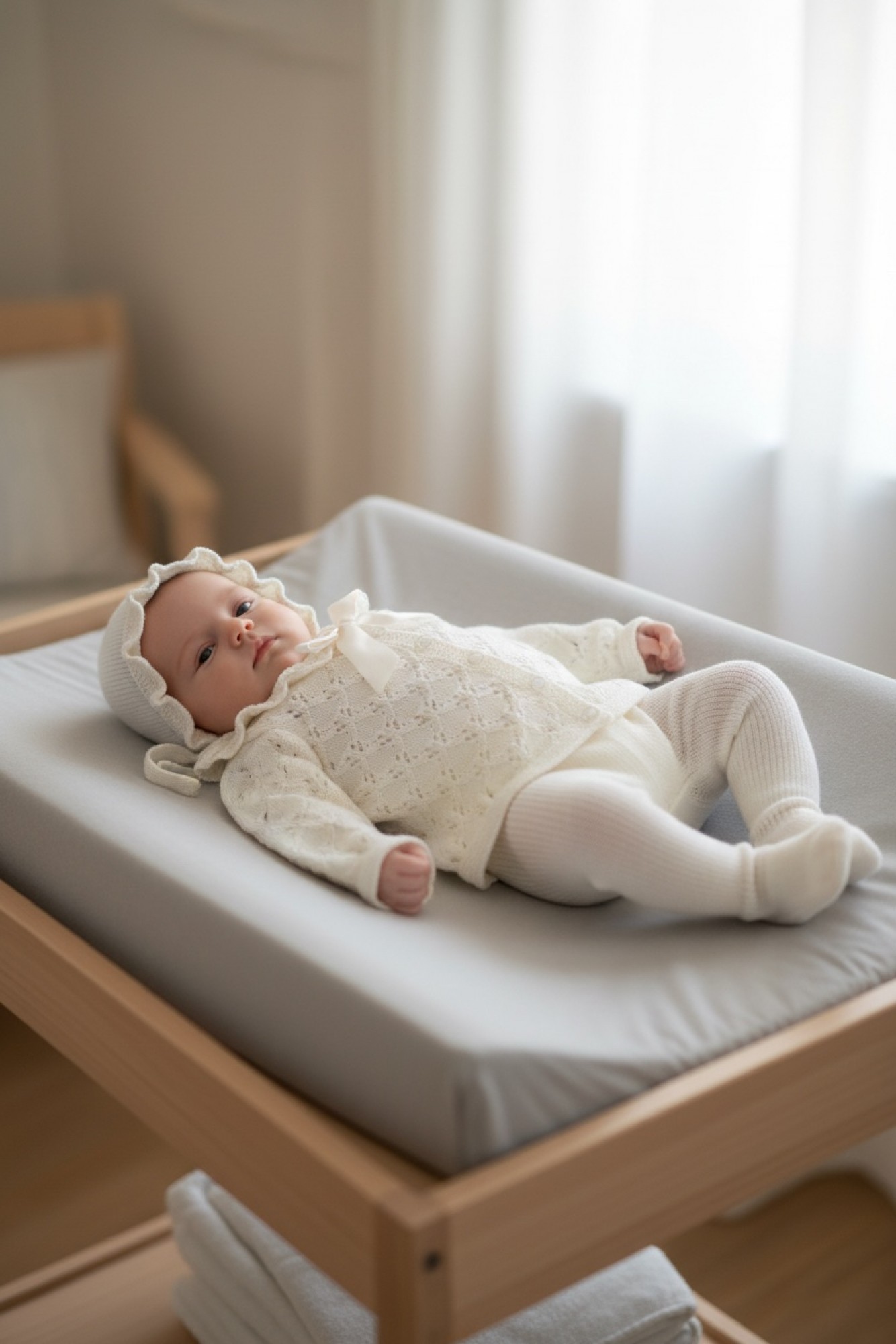 El tejido presenta un precioso dibujo calado que aporta textura y sofisticación sin perder suavidad. La chaqueta abotonada en la parte delantera y el lazo al cuello añaden un acabado clásico y muy cuidado. Se completa con polaina a juego y capota coordinada, creando un conjunto armonioso y muy especial.