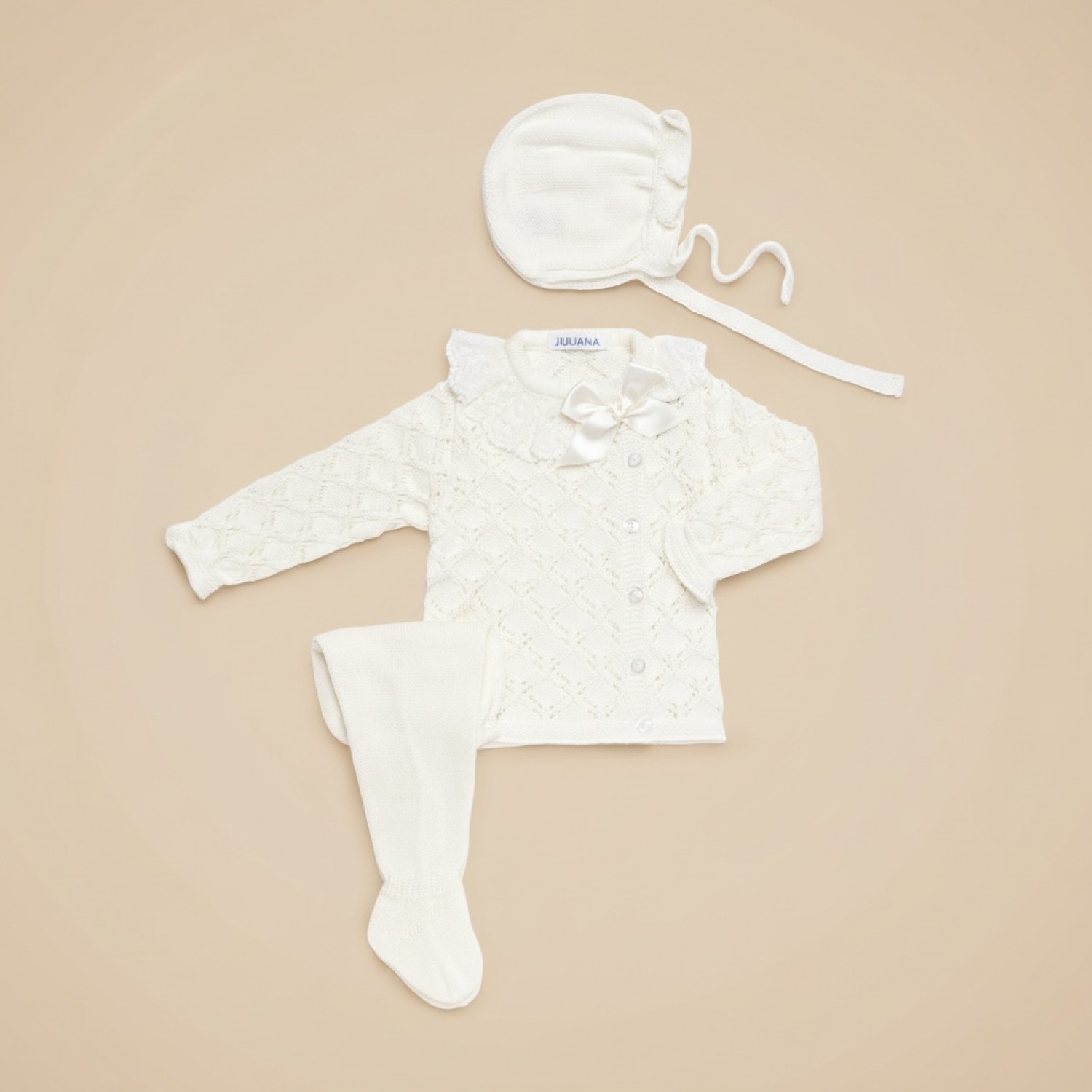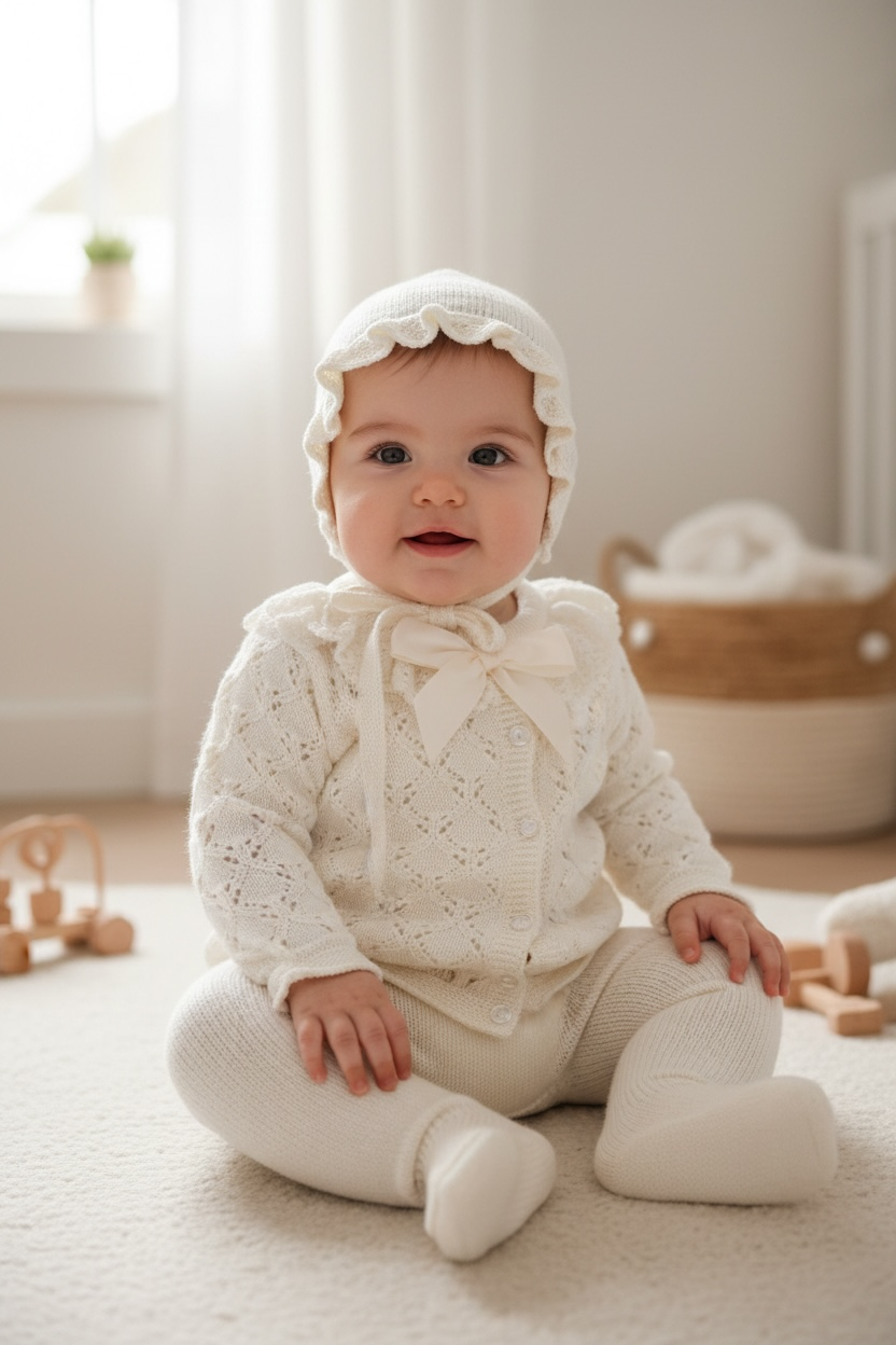 Conjunto unisex en punto fino color beige, una propuesta elegante y delicada ideal para ceremonia o eventos especiales.