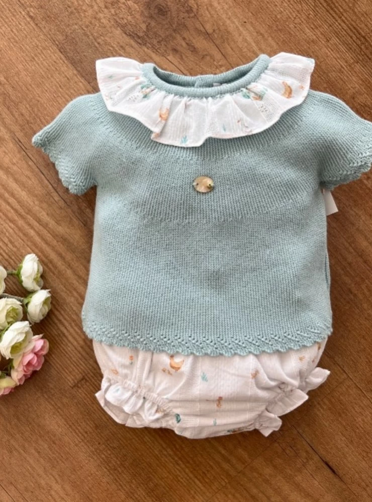 Jersey en punto de algodón 100 x 100 verde agua con cuello volantes en el mismo estampado que la braguita.