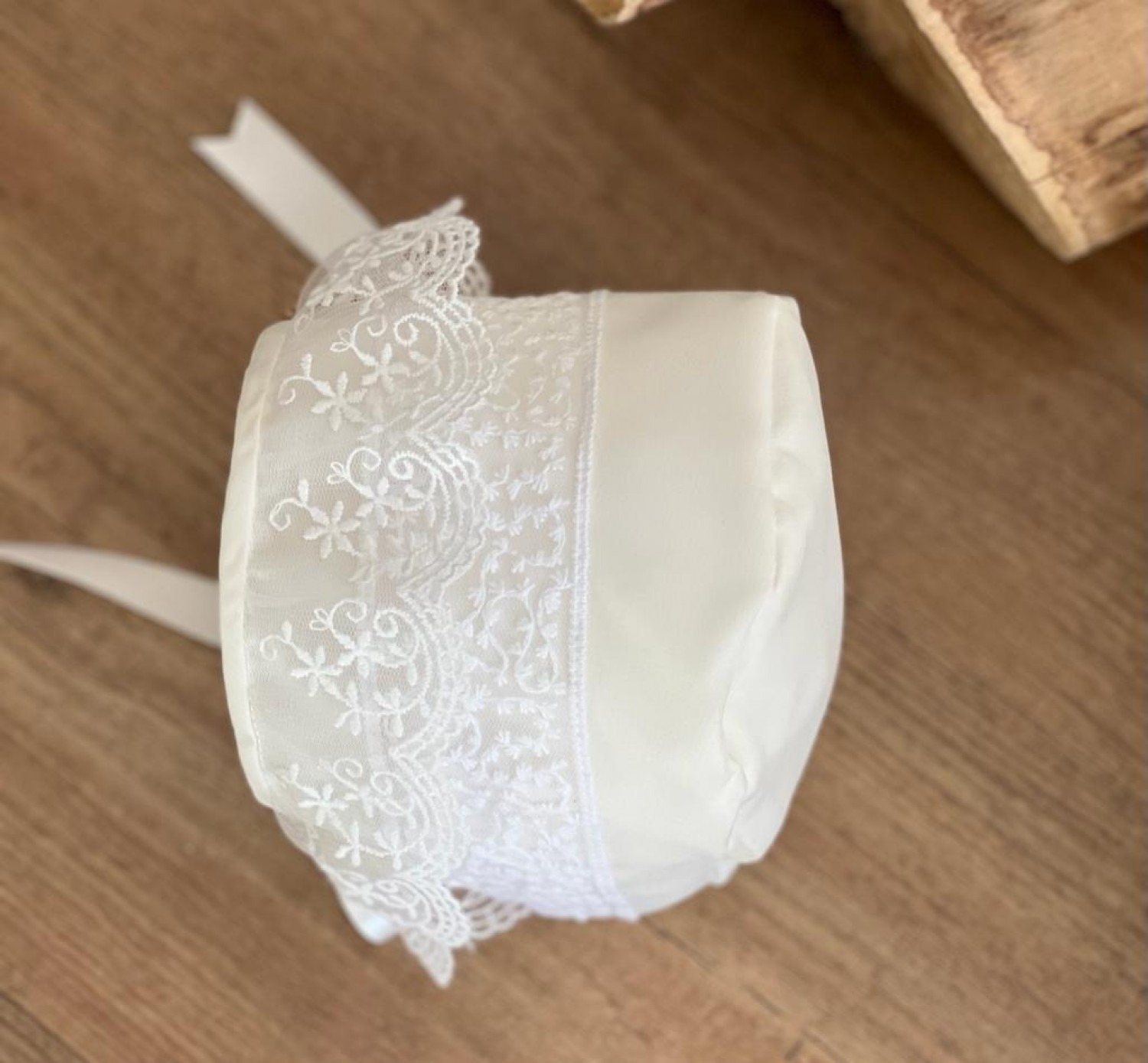Confeccionado en organza beige con puntilla y entredós de chantilly en color beige.