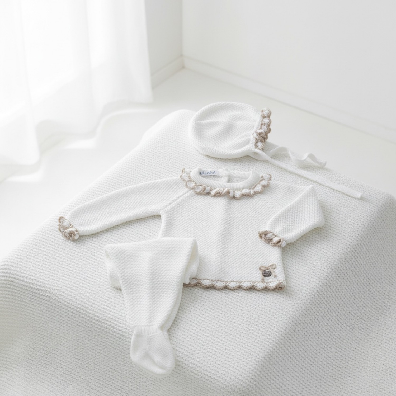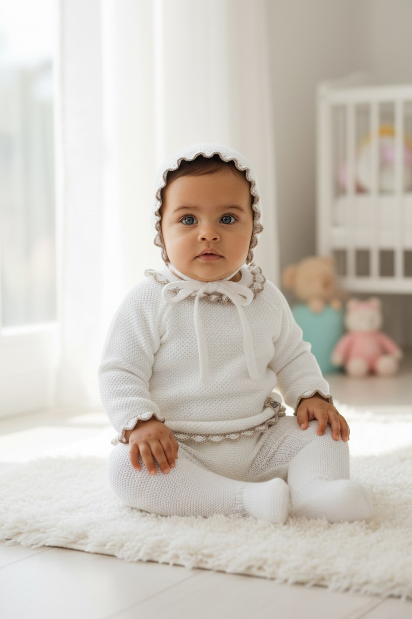 Conjunto unisex de tres piezas en punto de verano color blanco con detalles en arena, una combinación suave y elegante para los primeros meses.