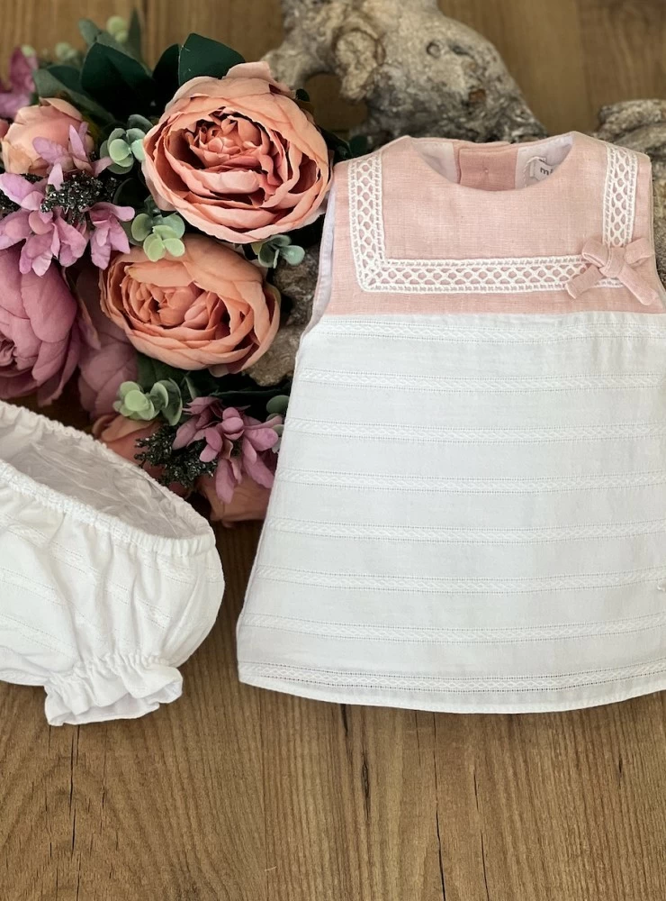 Confeccionado en Popelin blanco con Vainica. Cuerpo de lino rosa empolvado con puntilla de hilo.