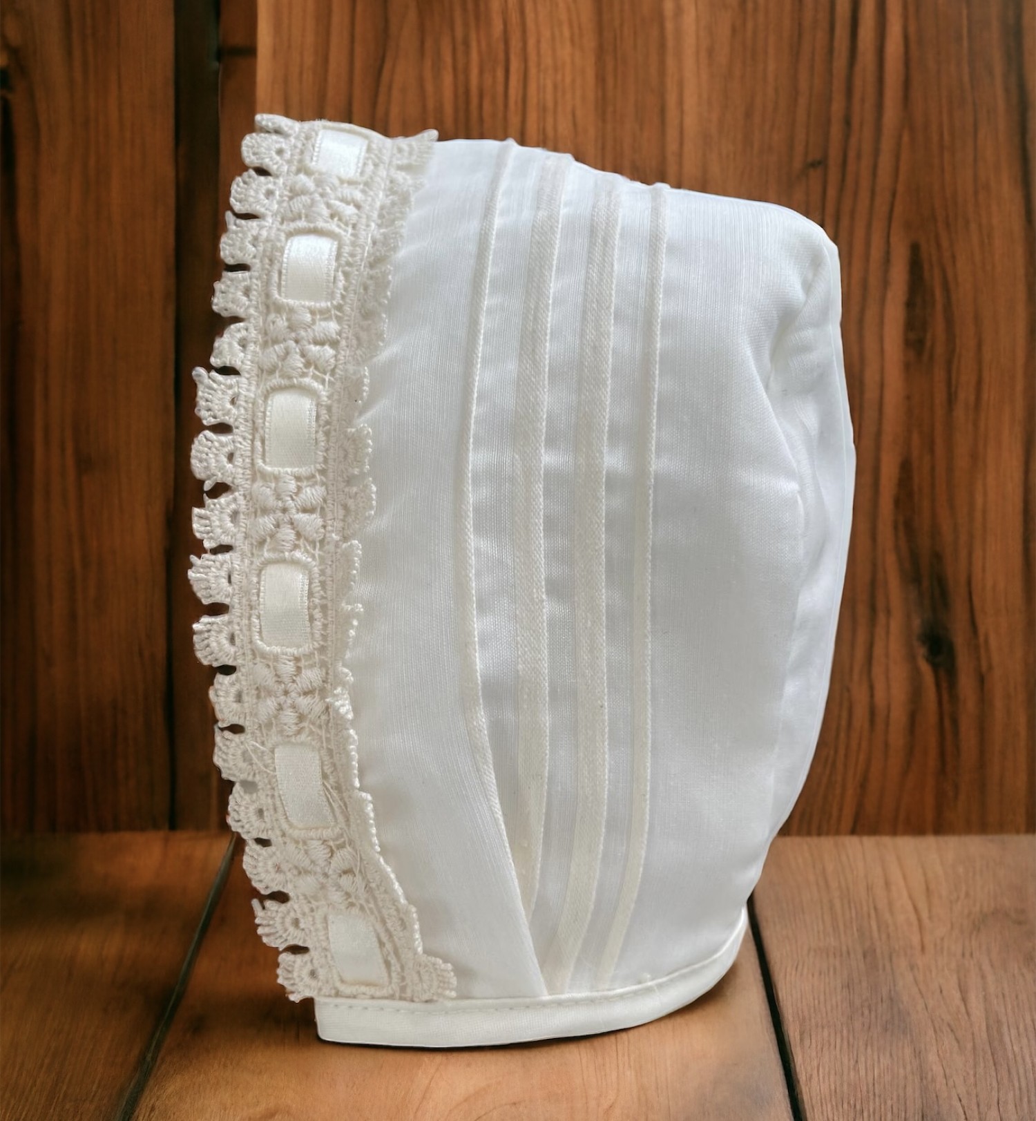 Confeccionado en tejido organza mate con jaretas, lleva cuerpo y capota con jaretas también y puntilla de bolillos, tiene pasacintas con dos finos lazos a los costados, manga larga por la muñeca