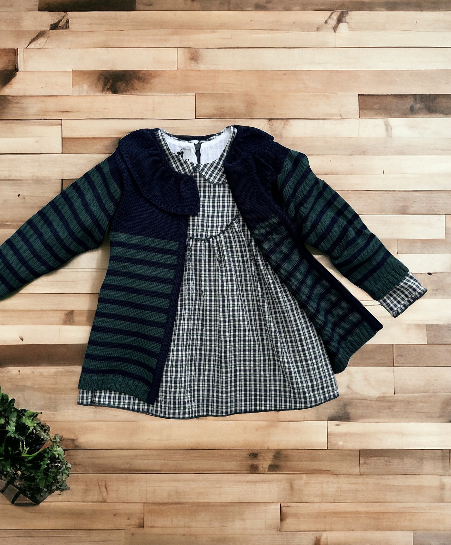 Vestido con cuellos bebé y manga larga confeccionado en bambula con cuadro Escocés en tonos verde y marino, Con la chaqueta en punto larga, lleva cuello volante y es de rayas marino y verde. Maravilloso conjunto
