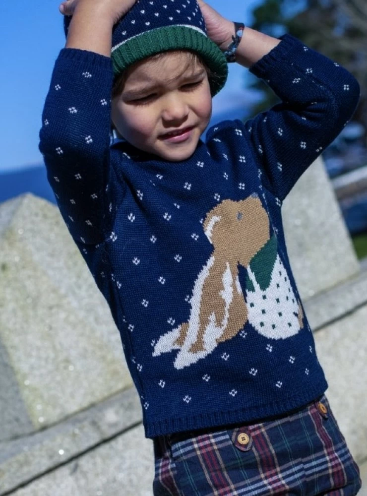 Es de punto doble en tonos marino jaspeado en crudo y con un bonito conejo en verde y camel.