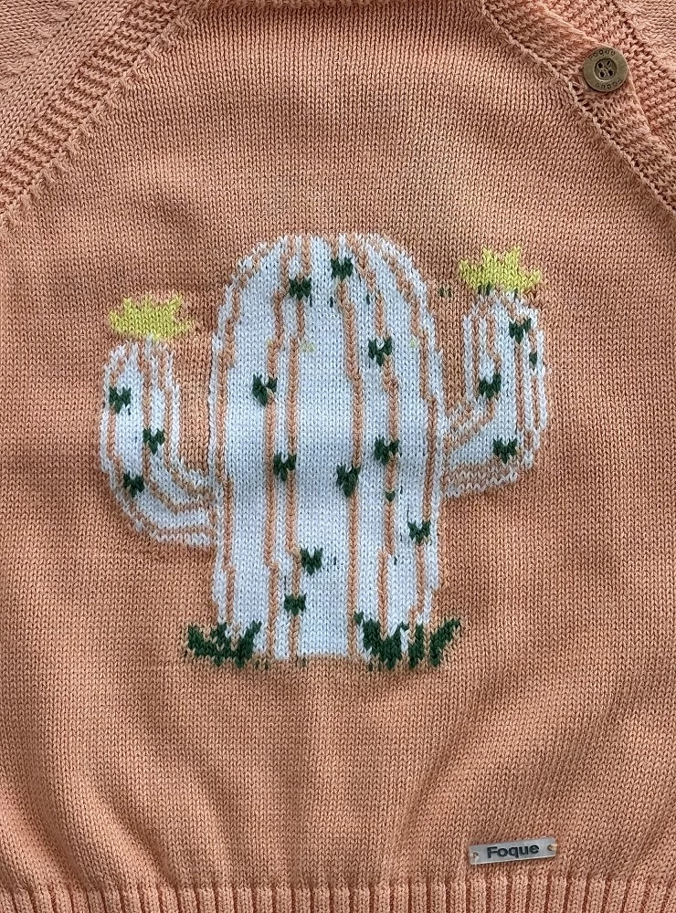 Confeccionado en punto de verano color melocotón con un gracioso cactus.