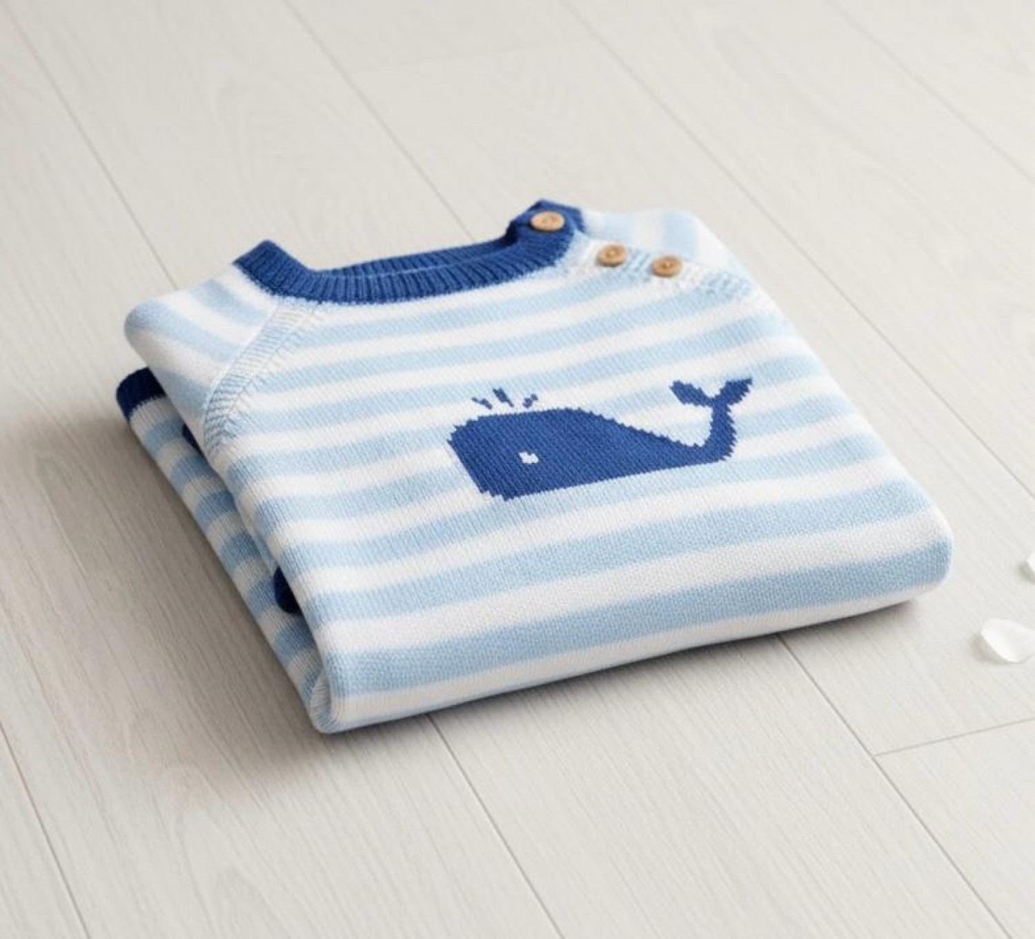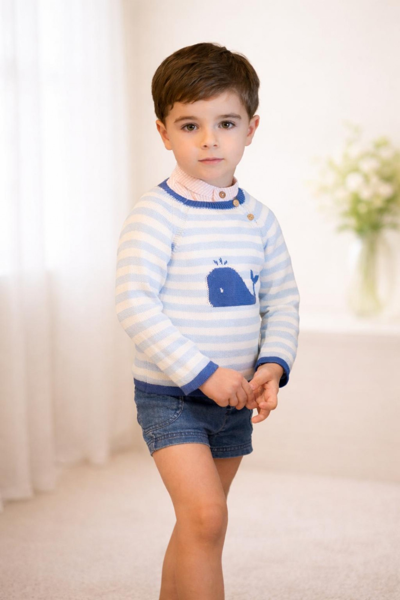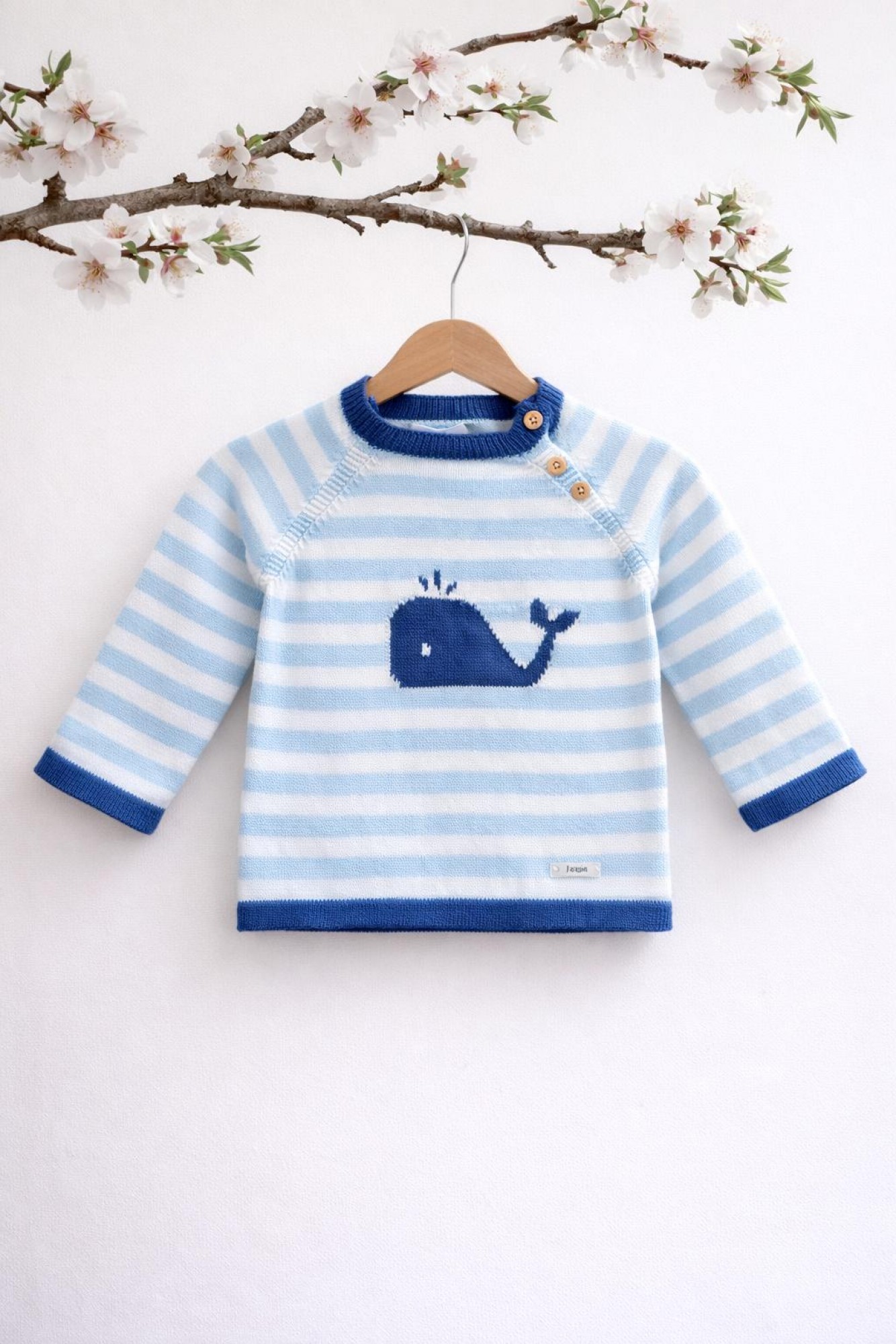 Destaca por su simpático dibujo central de ballena en tono azul más intenso, que le da un toque divertido y especial. El cuello, los puños y el bajo en contraste realzan la prenda, mientras que los botones en el hombro facilitan su puesta.