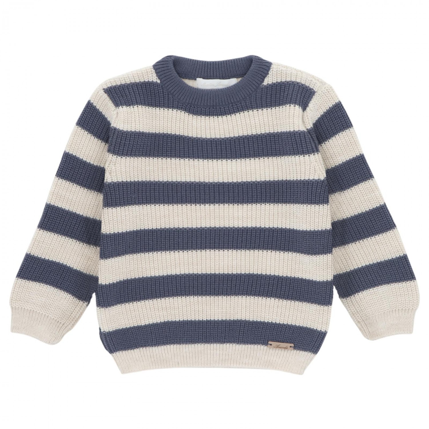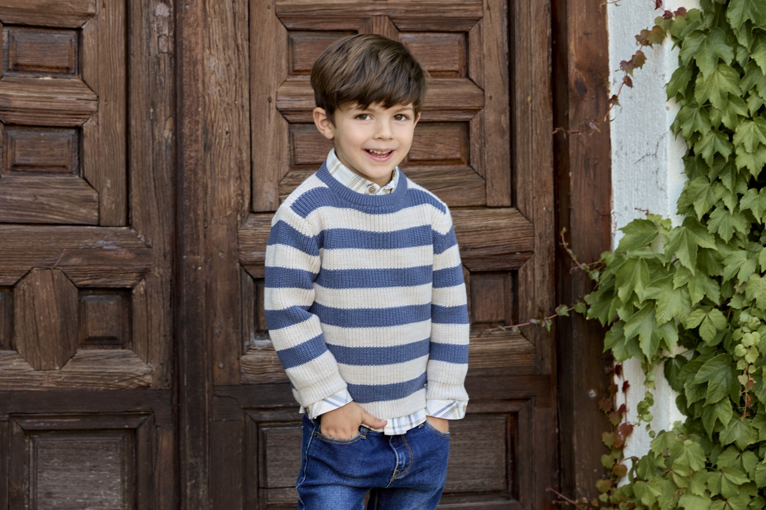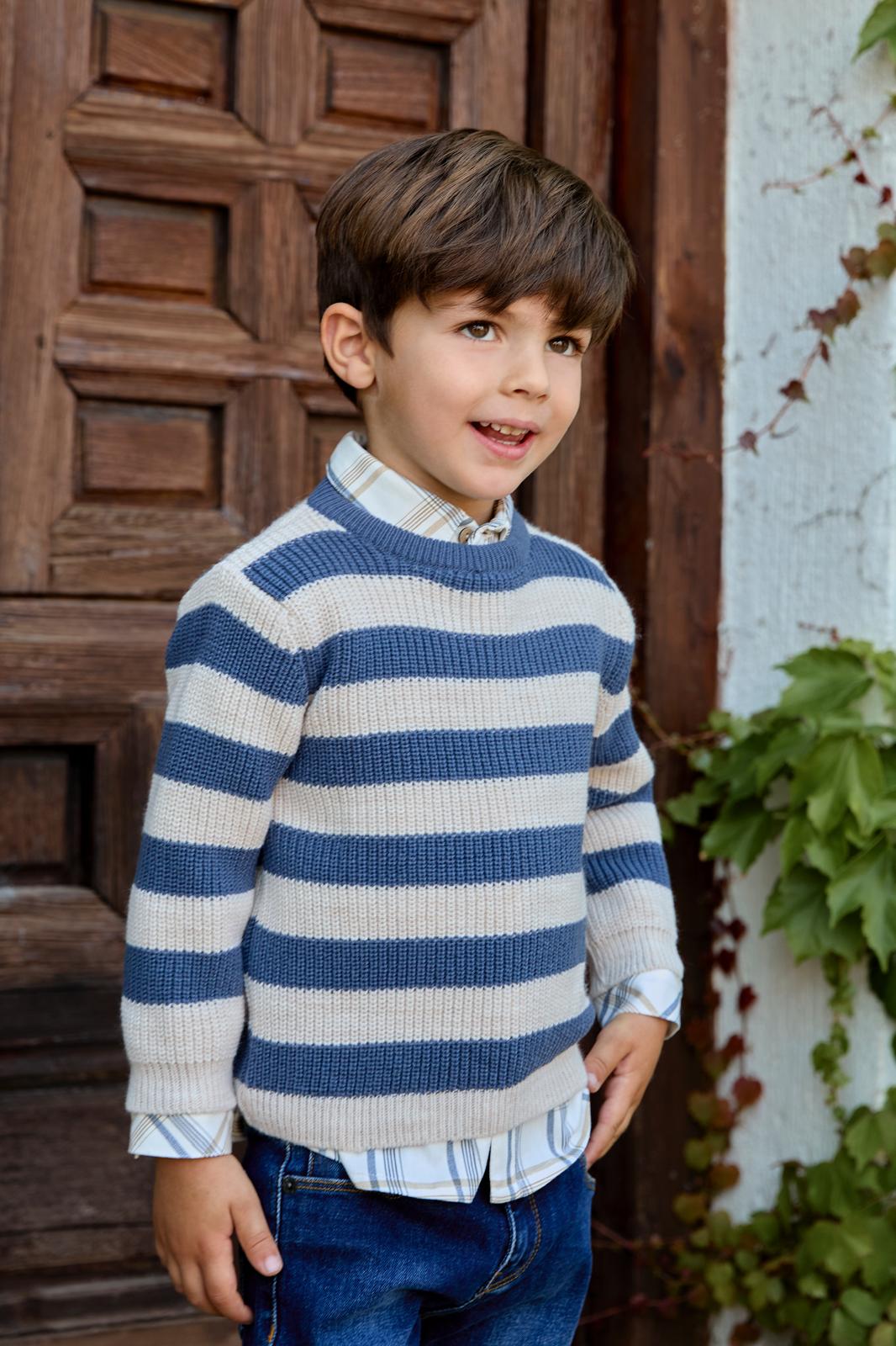 Jersey infantil de punto con rayas anchas en tonos azul y beige, un diseño clásico y cómodo que combina fácilmente con camisas o jeans.