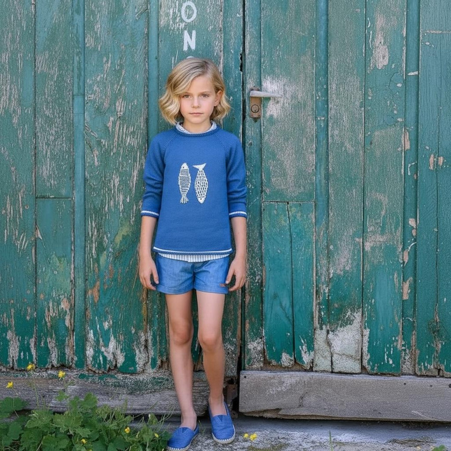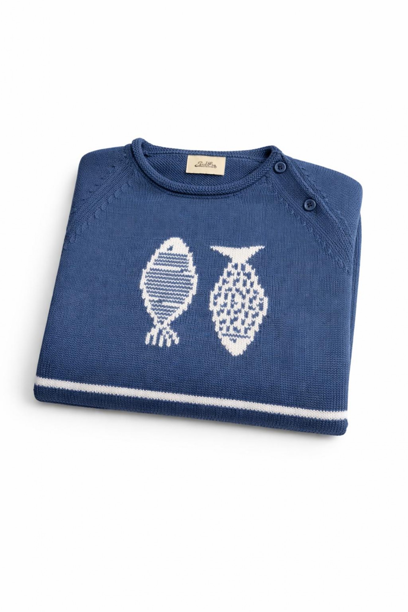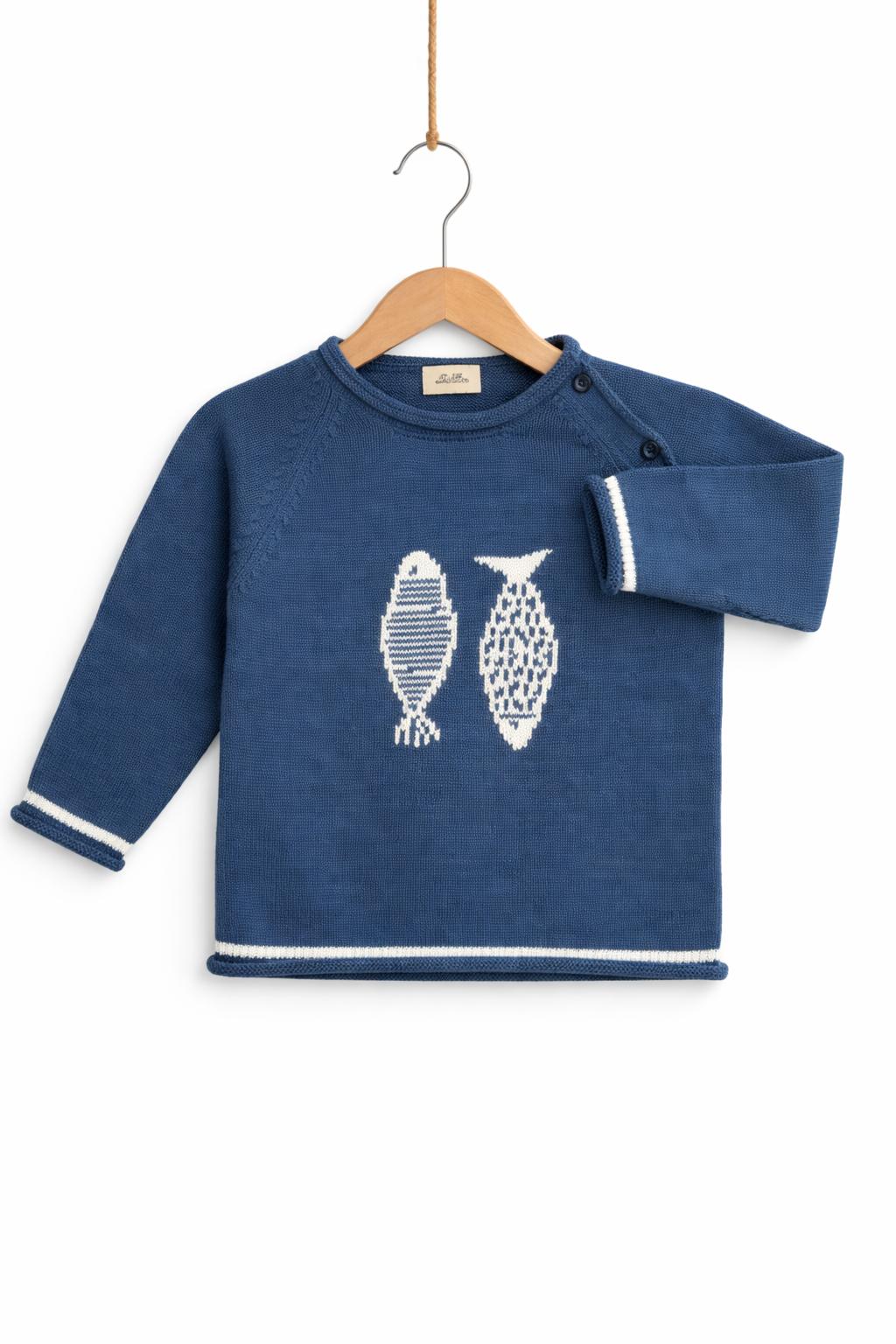 Jersey de punto en color azul medio ligeramente empolvado, con dibujo central de dos peces en blanco. Uno de ellos presenta diseño de rayas horizontales y el otro un dibujo calado en forma de rombos, creando un contraste delicado y muy original.