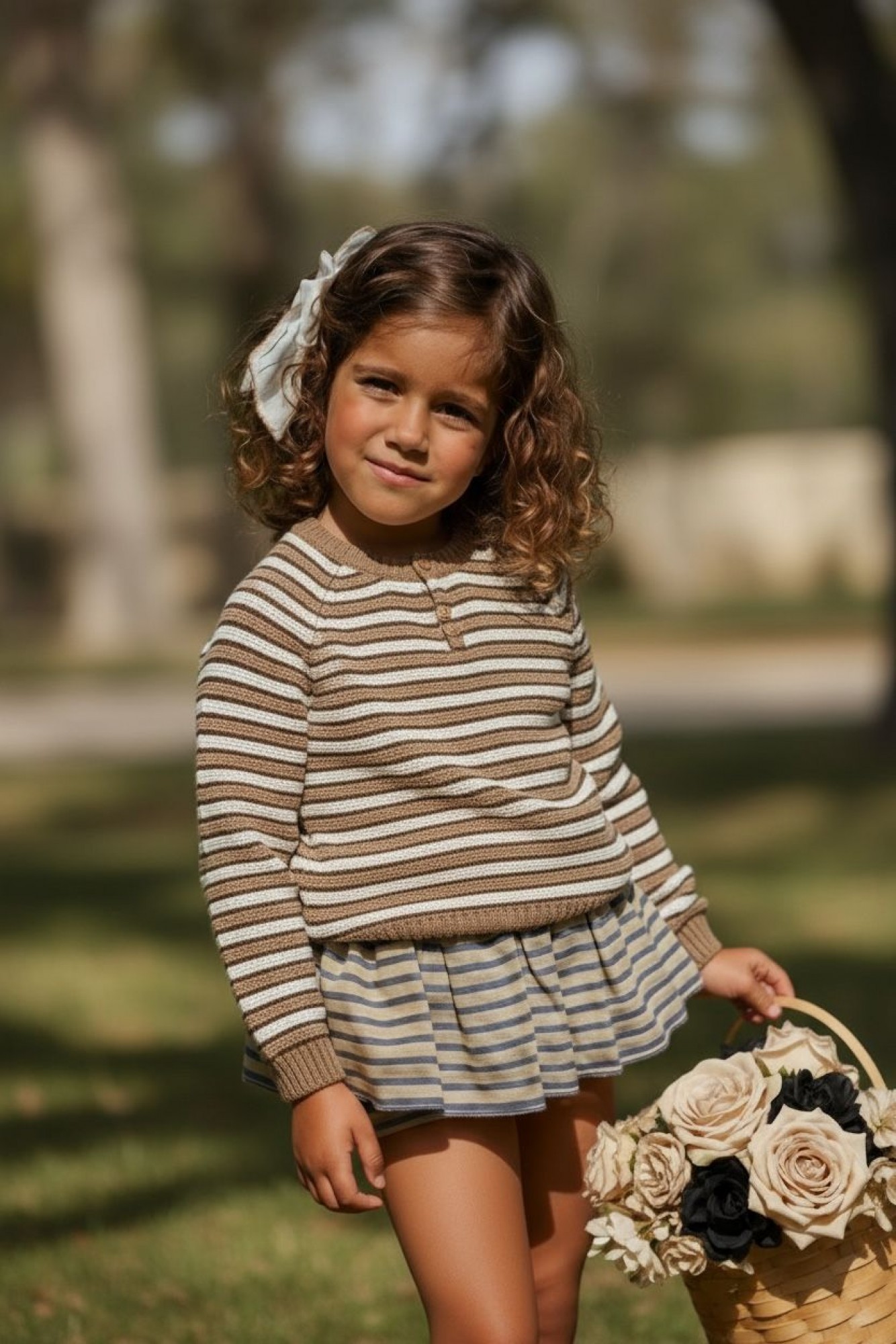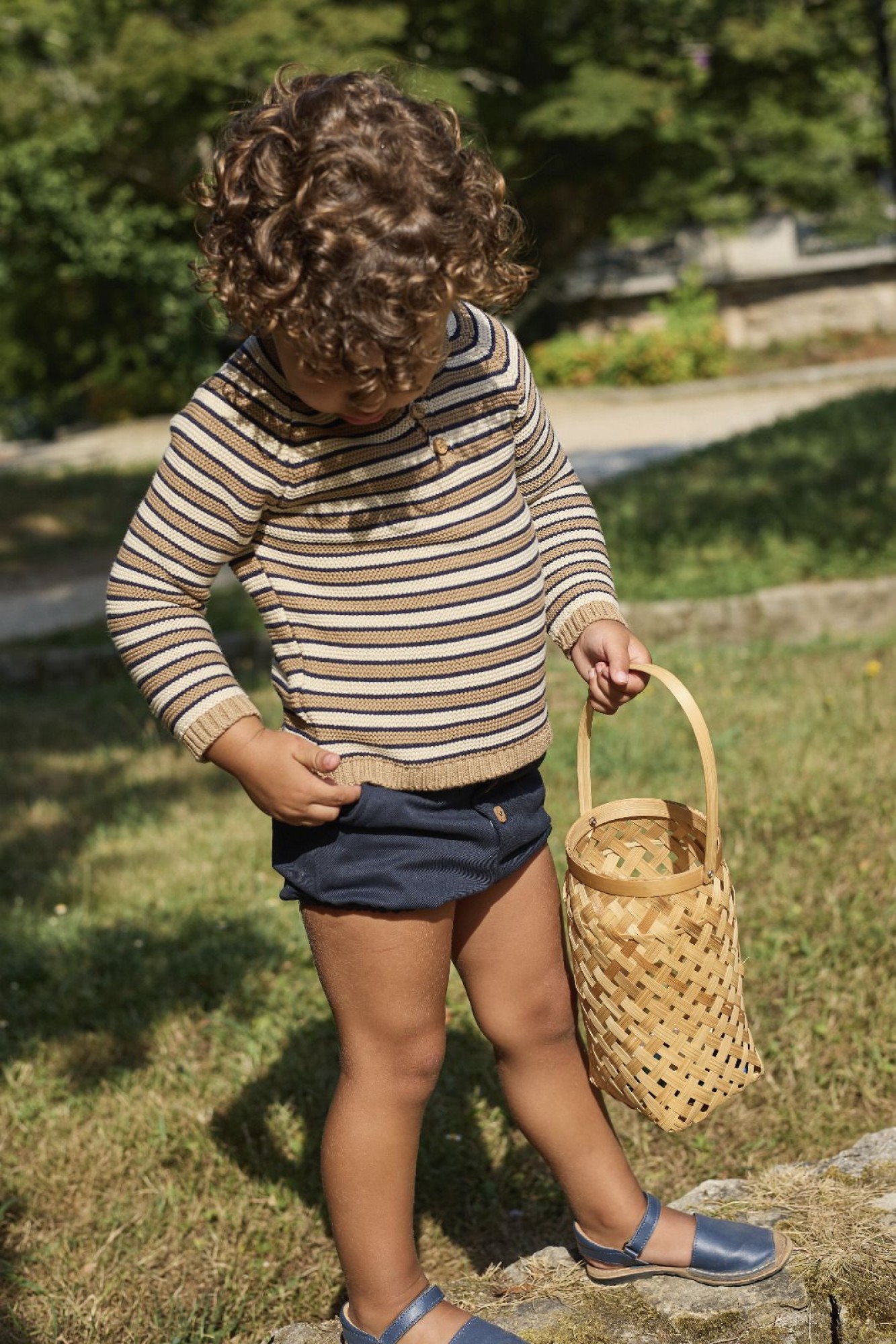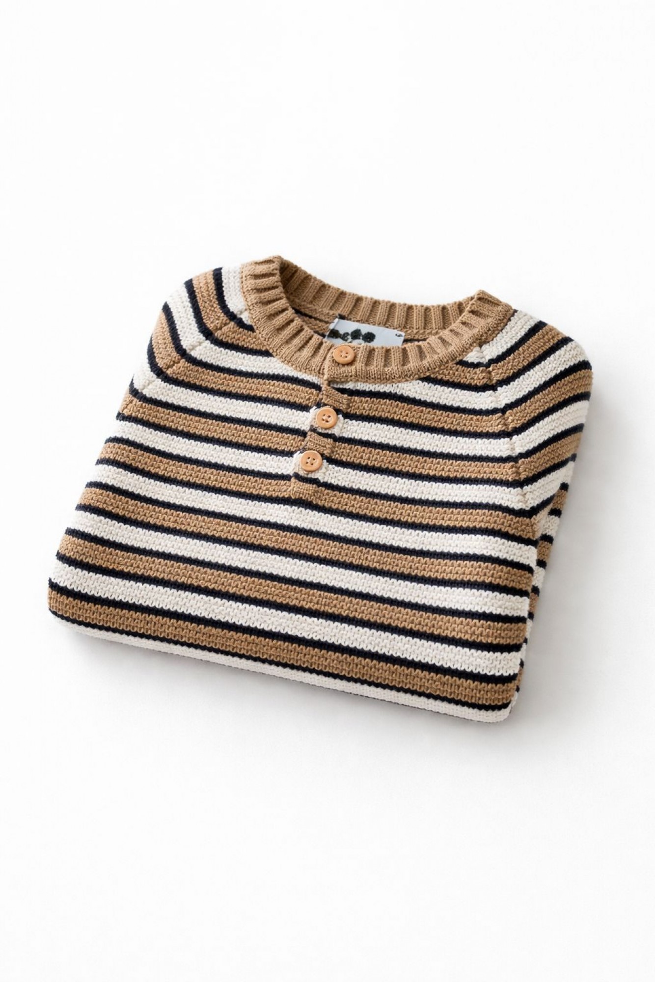 Jersey unisex de punto fino con diseño de rayas horizontales en tonos beige, camel, blanco y azul marino, creando una combinación elegante y muy versátil.