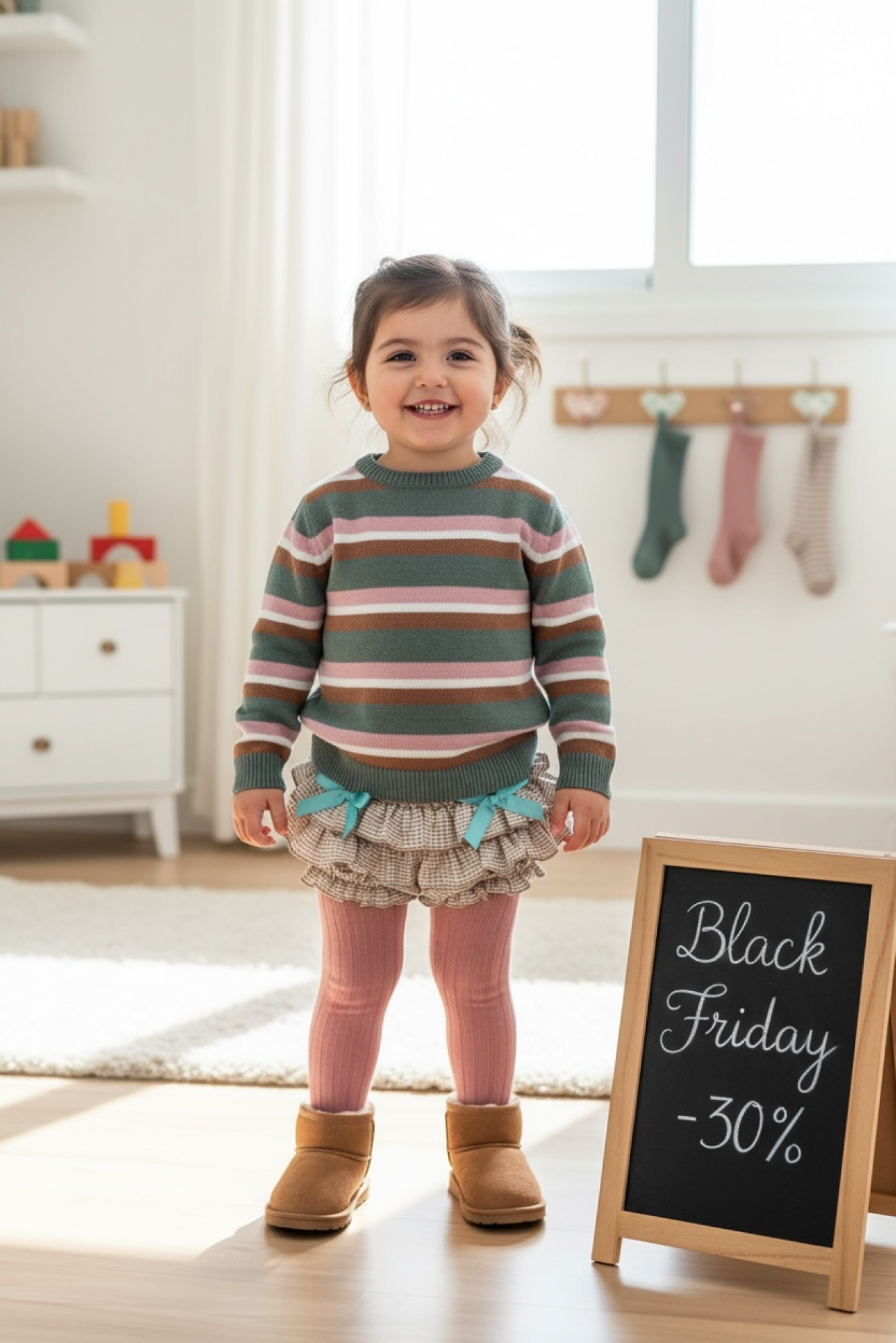 Suéter en punto finito de gran calidad con rayas en varios tonos, verde, blanco, rosa y camel, la braguita con volantes en cuadrito vichy camel con lazo verde agua. Super bonito