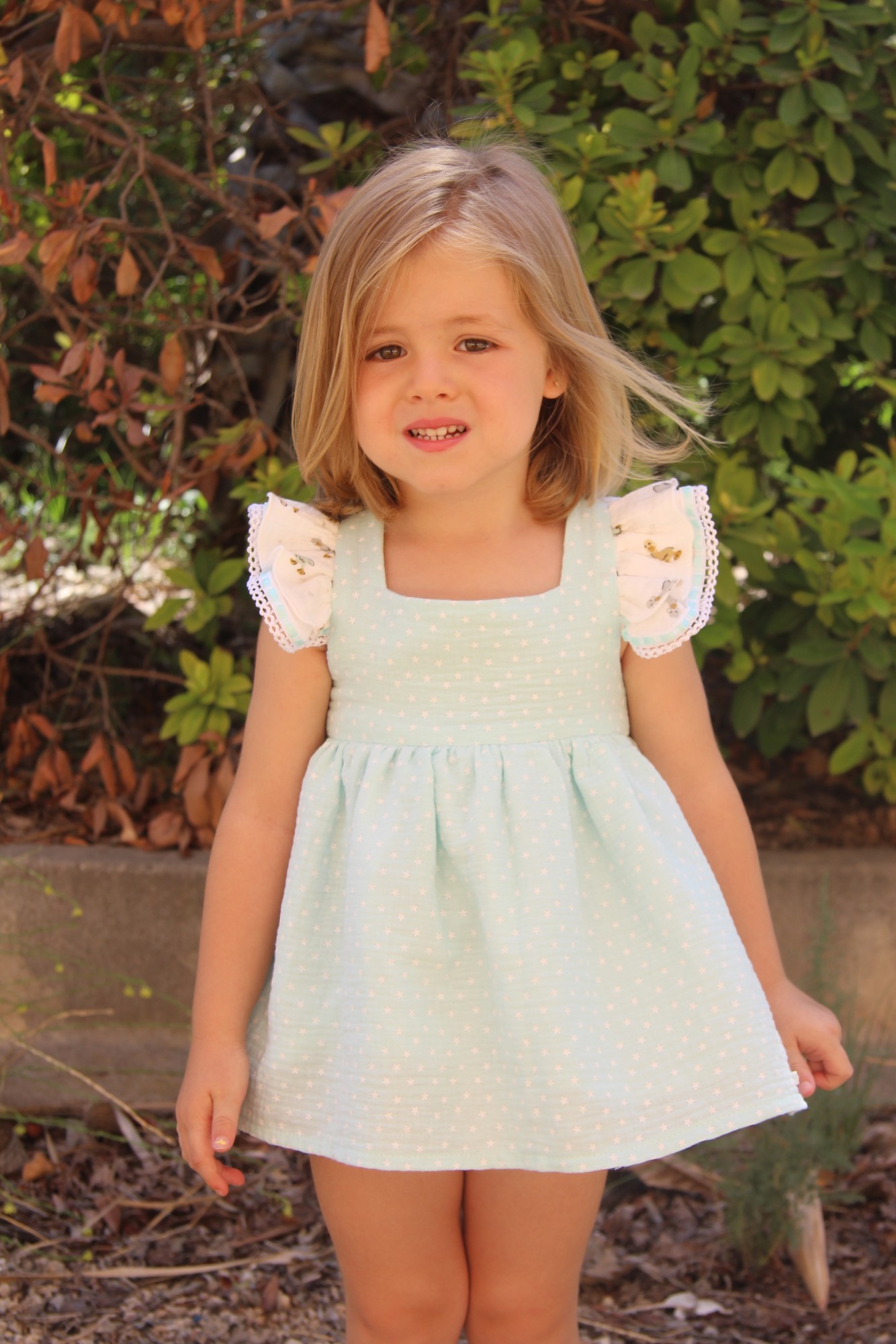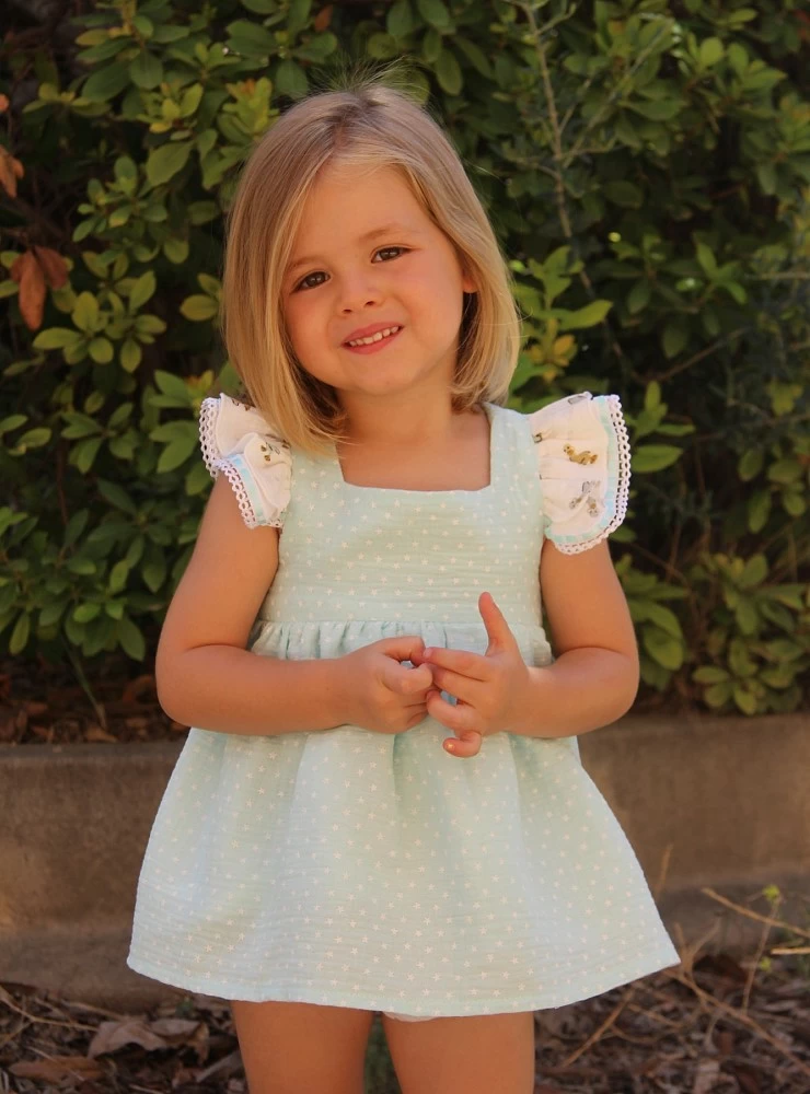 Jesusito tipo pichy en bambula verde agua con estrellas, tiene remate en mangas con estampado patitos a juego con la braga. Es muy original