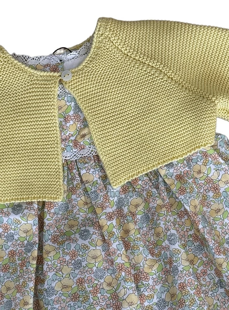 Jesusito y braga con estampado flores en tonos amarillo y verde , con chaqueta en punto de algodón color amarillo pistacho.