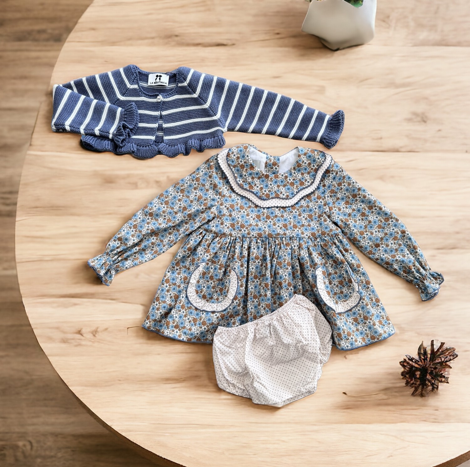 Jesusito de popelín estampado flores liberty en tonos azules y marrón. Lleva braguita con topos y chaqueta corta de rayas en los mismos tonos. Doble cuello flores y topos. Muy original