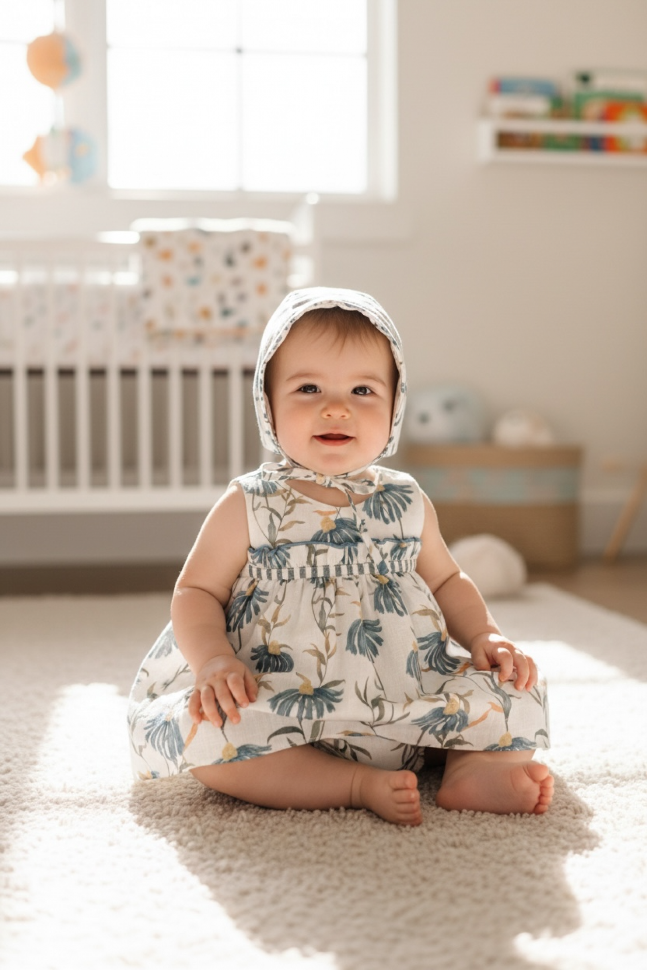 • Jesusito con capota y braga, confeccionado en un tejido percal, muy similar al tino. Es con fondo blanco y flores en azulón y mostaza.