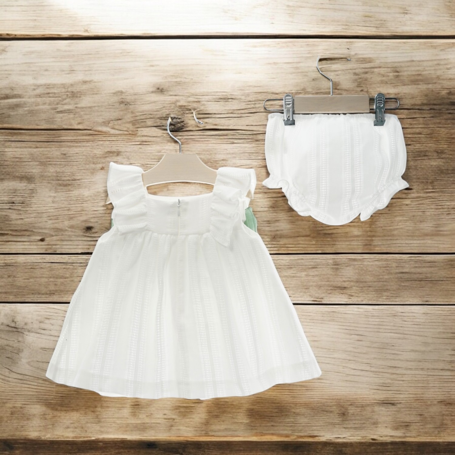 • Jesusito con braguita Confeccionado en un tejido de batista de algodón con vainica, lleva dos lazos drapeados en verde hierva. Muy original