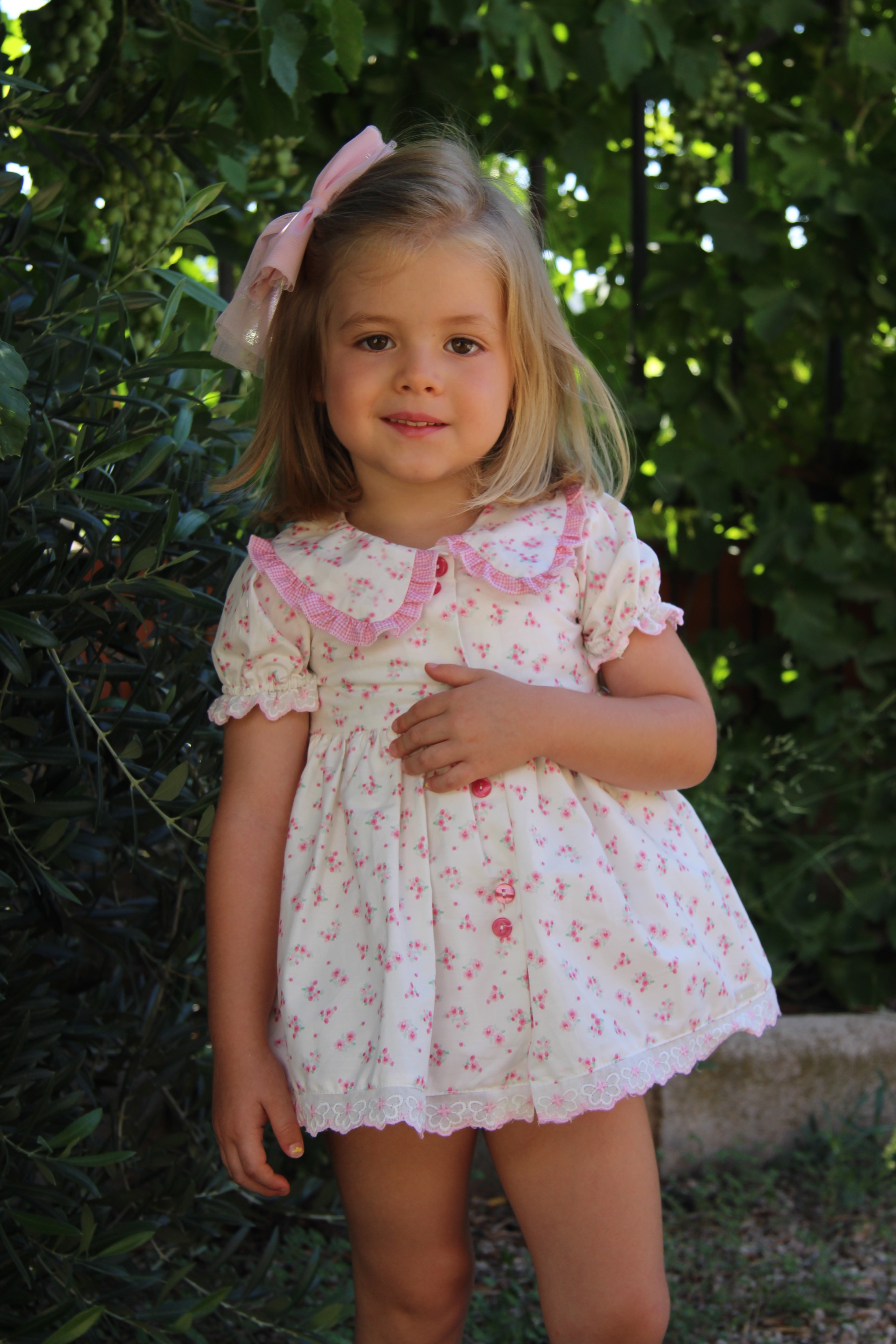 Confeccionado en batista blanca con flores en fucsia, lleva remates con cuadro vichy a juego con la braga. Puntilla bordada en el bajo y puños
